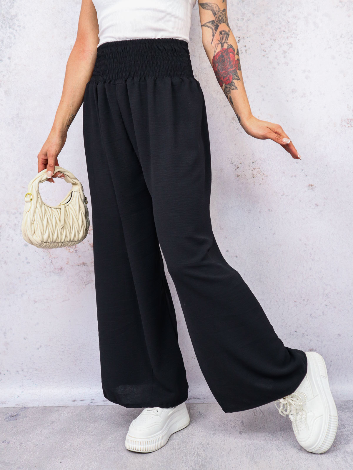 SPODNIE MATERIAŁOWE Z SZEROKIMI NOGAWKAMI I GUMĄ W PASIE- CZARNE