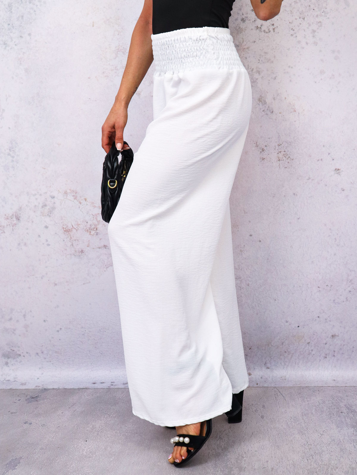 SPODNIE MATERIAŁOWE Z SZEROKIMI NOGAWKAMI I GUMĄ W PASIE- BIAŁE