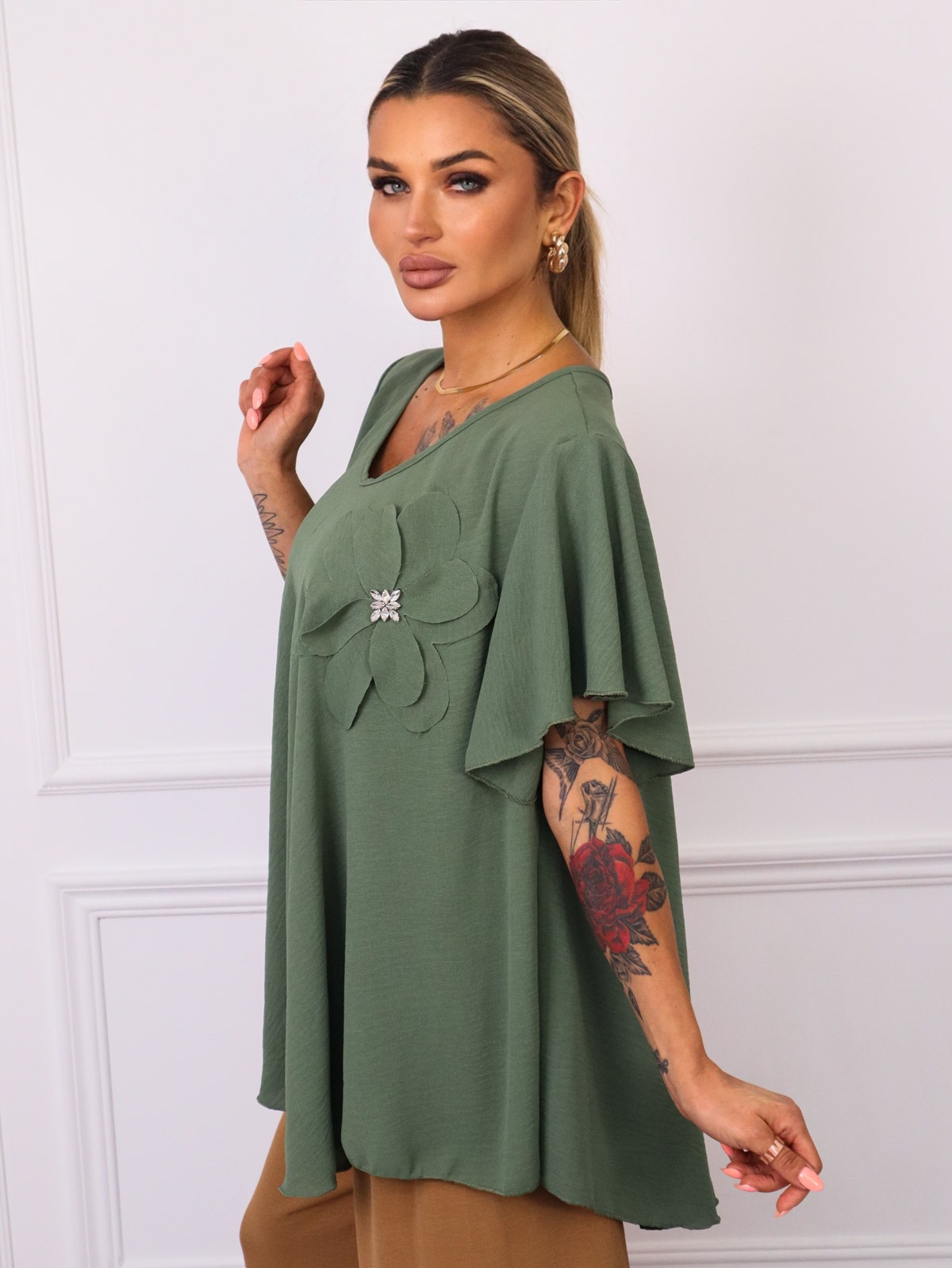 BLUZKA Z KWIATEM I OZDOBNYMI CYRKONIAMI- ZIELONA
