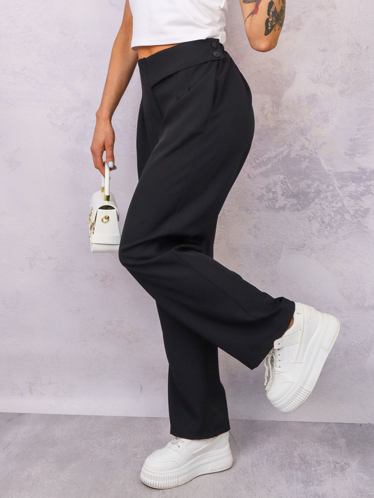 SPODNIE MATERIAŁOWE Z OZDOBNYM ZAPIĘCIEM NA BOKU- CZARNE