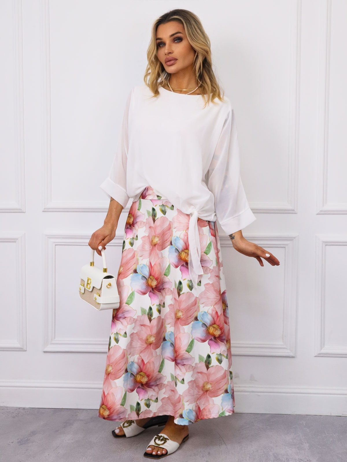 BLUZKA SZYFONOWA O KROJU NIETOPERZA Z WIĄZANIEM- BIAŁA