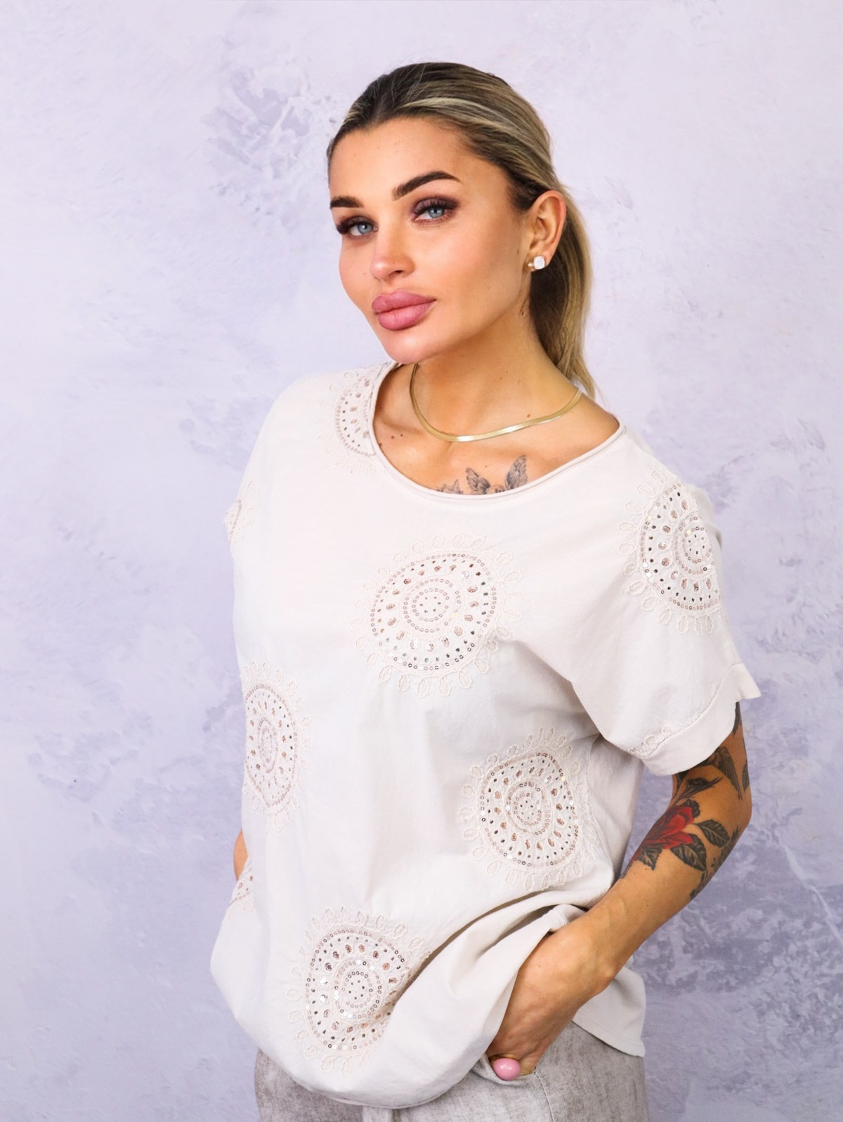 BLUZKA Z HAFTOWANYM WZOREM ZDOBIONA CEKINAMI- BEŻOWA