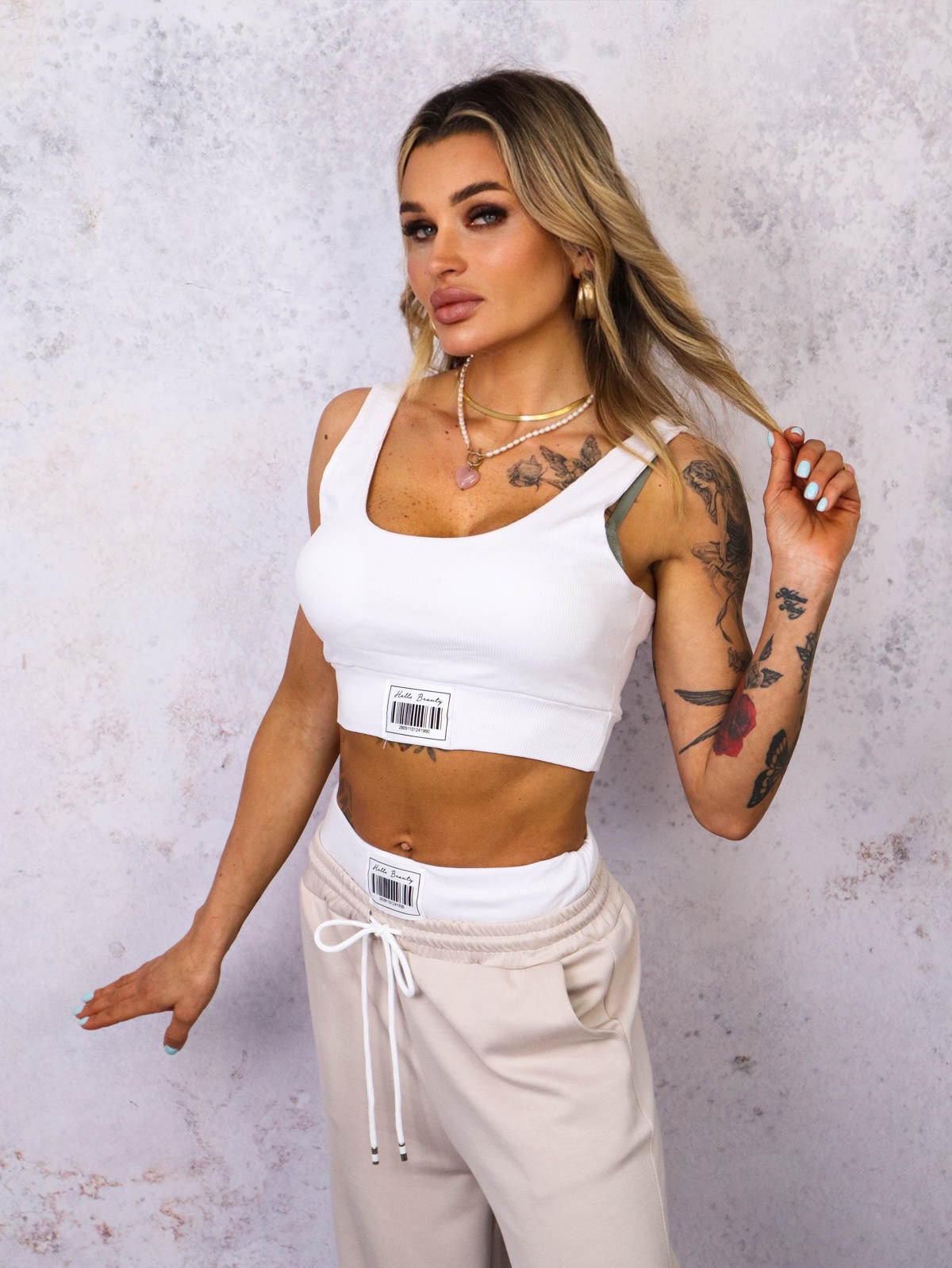 Komplet dresowy dwuczęściowy. Top z prążkowanego materiału z naszywką, na ramiączkach. Spodnie z szerokimi nogawkami, kontrastowy pas z ozdobną naszywką. W pasie guma i wiązanie.