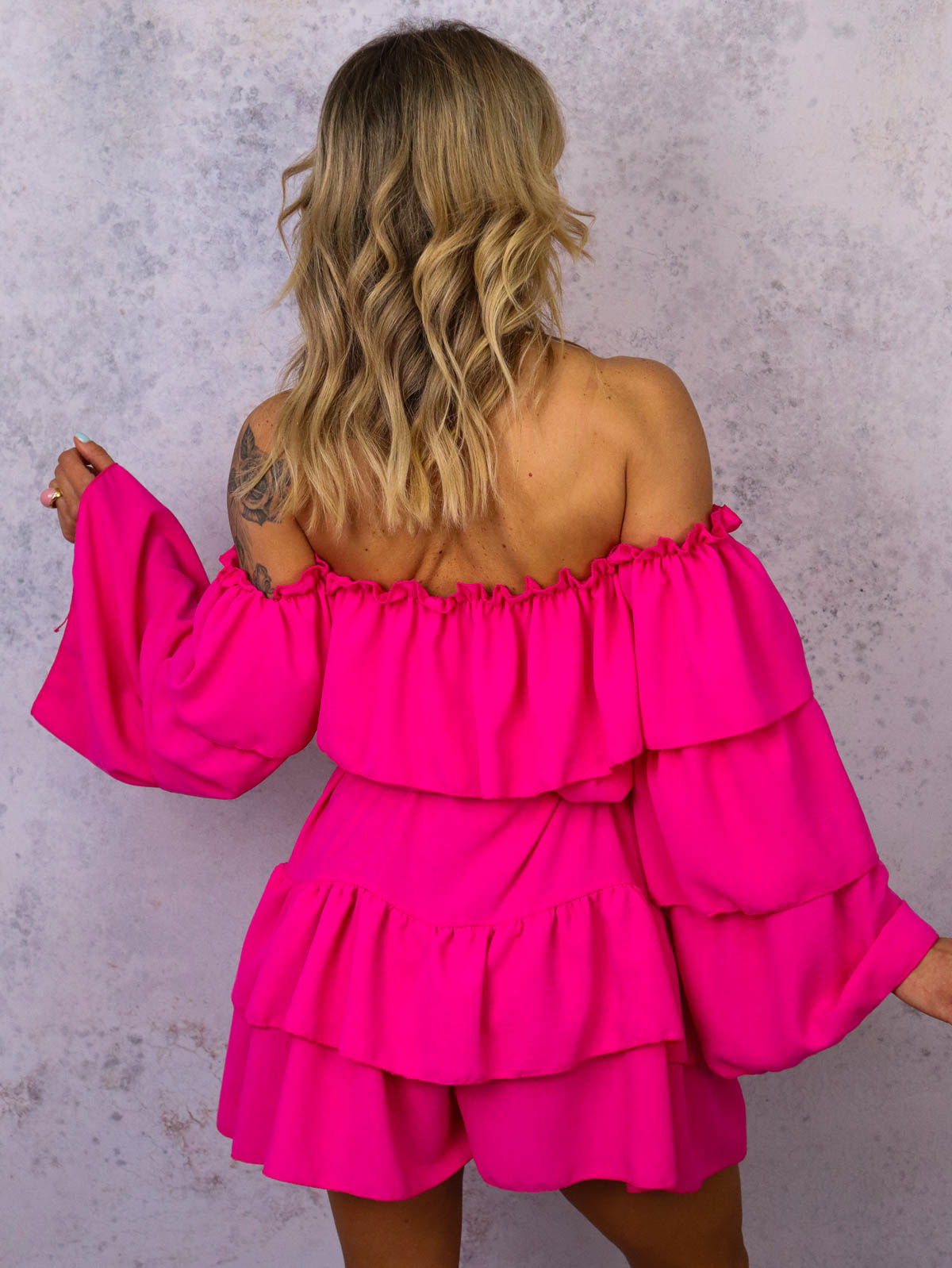 KOMBINEZON HISZPANKA Z FALBANAMI I PASKIEM- FUKSJA