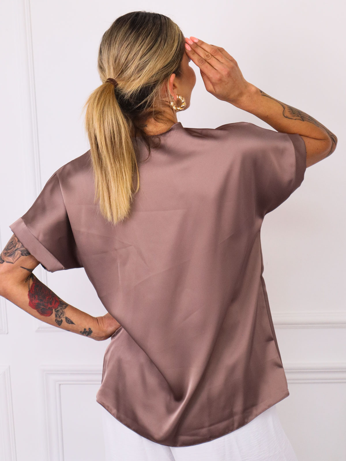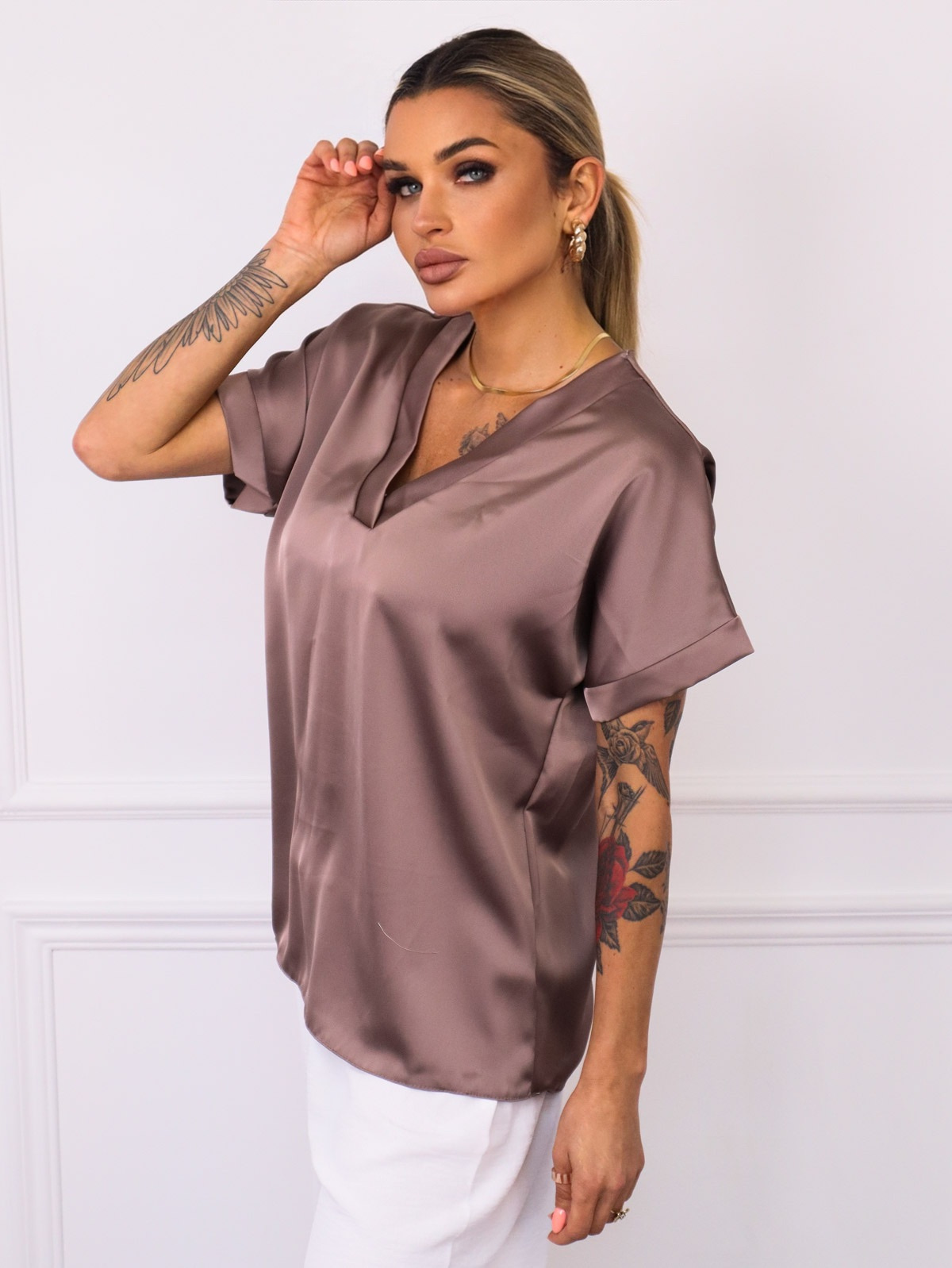 BLUZKA SATYNOWA Z DEKOLTEM W SEREK- BRĄZOWA