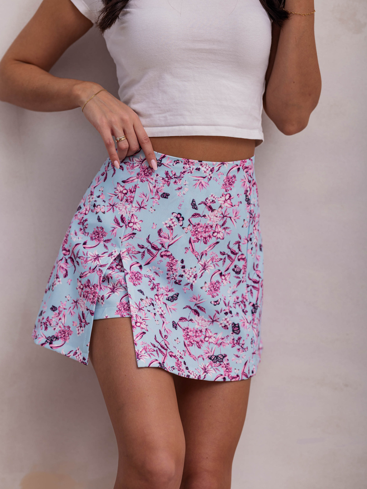 KOMPLET ELEGANCKI MARYNARKA W KWIATY+ SPÓDNICO-SPODENKI- NIEBIESKI
