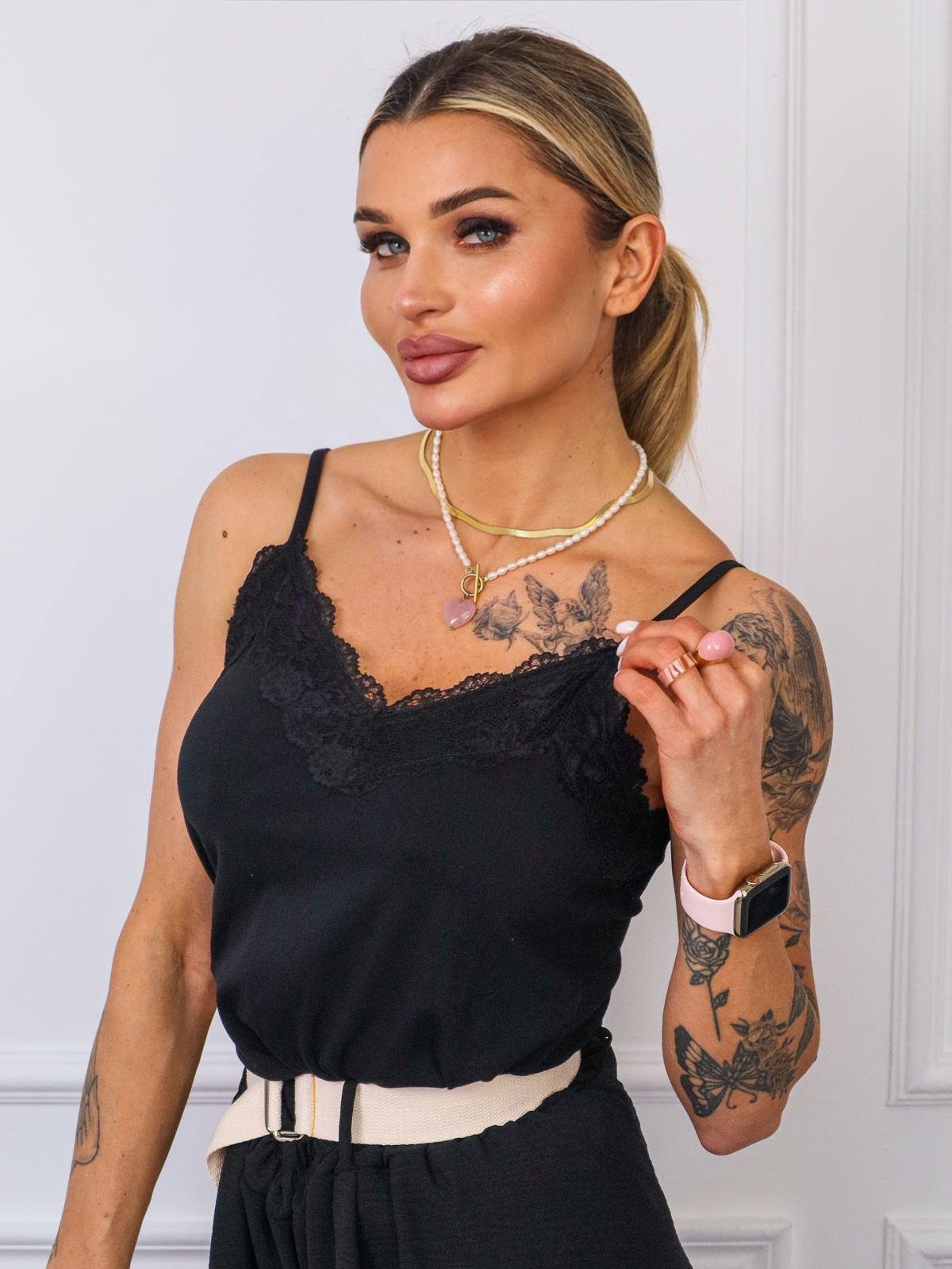 TOP NA RAMIĄCZKACH Z OZDOBNĄ KORONKĄ- CZARNY