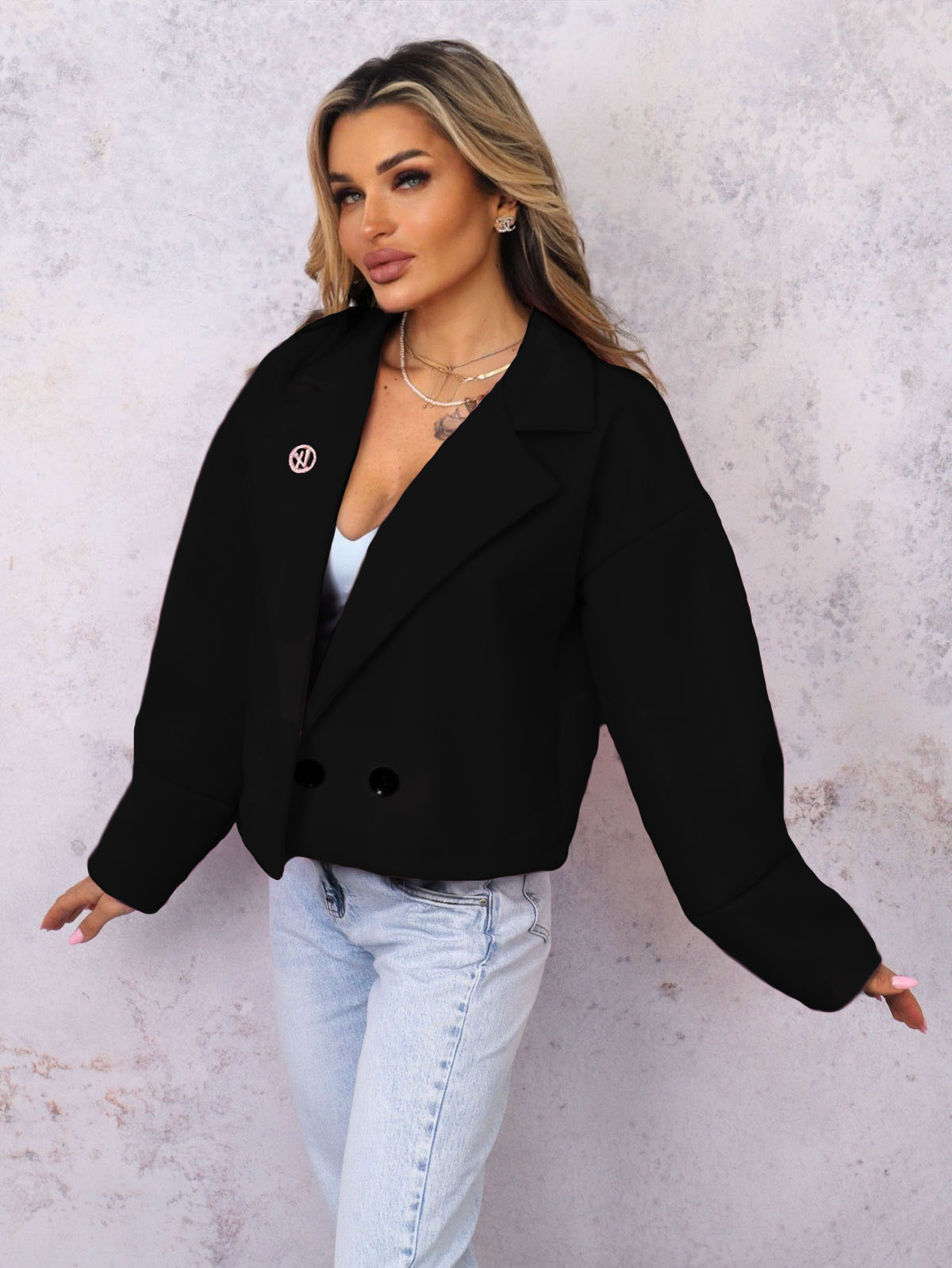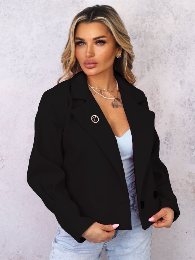 KRÓTKI PŁASZCZ Z KOŁNIERZEM I OZDOBNĄ BROSZKĄ- CZARNY