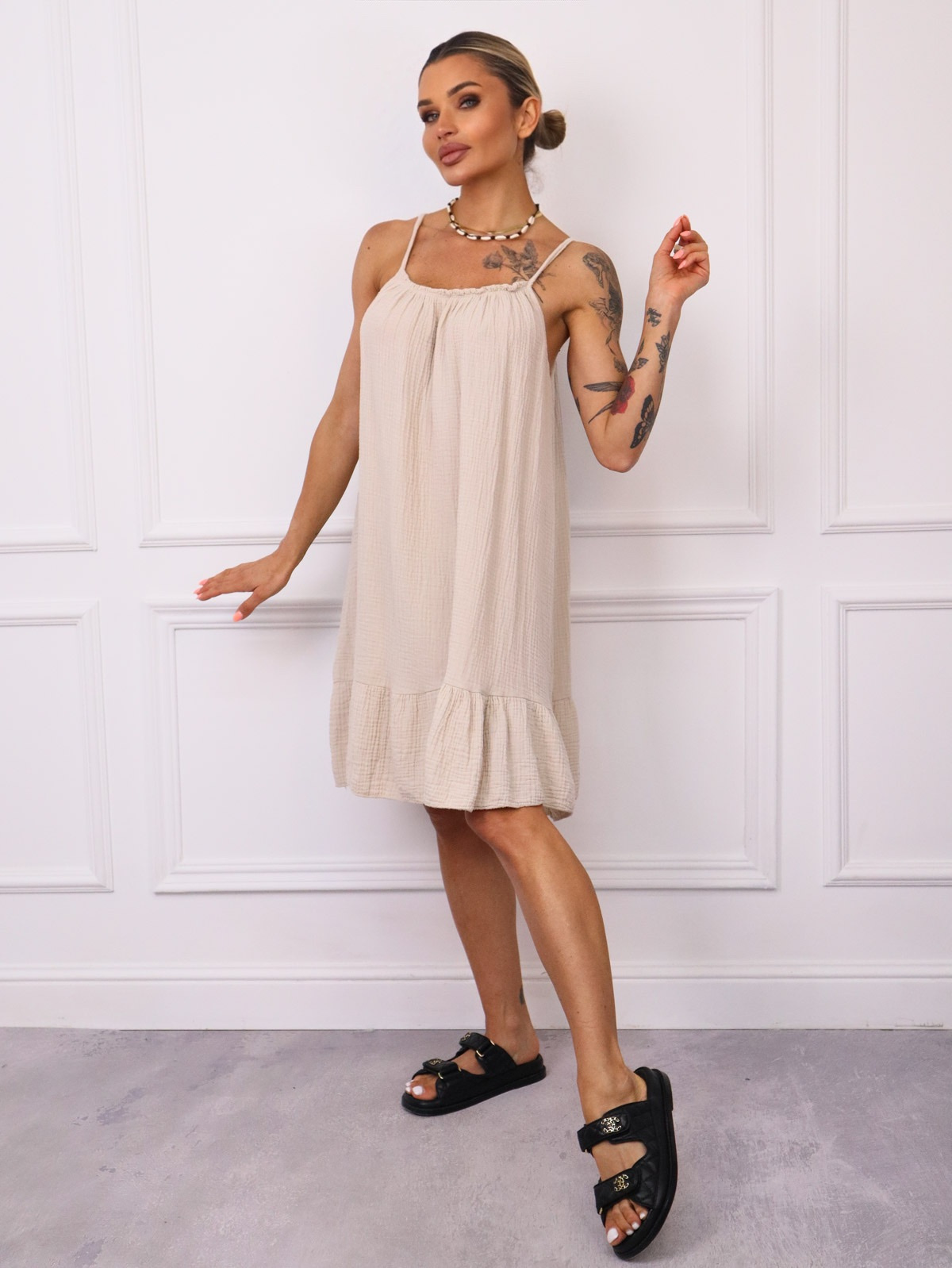 Sukienka mini wykonana z wysokiej jakości muślinowego materiału. Falbana na dole.