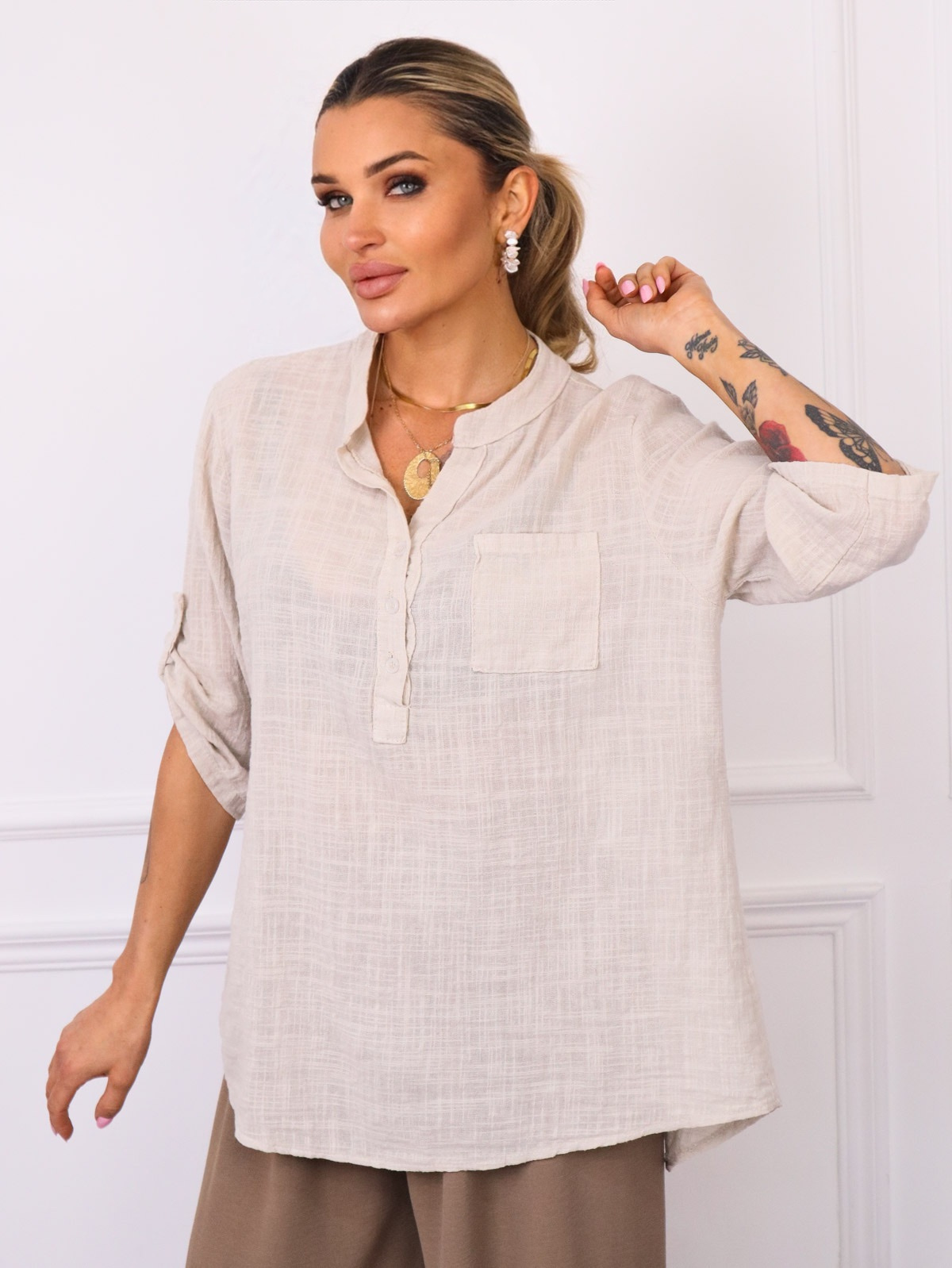 BLUZKA KOSZULOWA ASYMETRYCZNA Z LNEM- BEŻOWA