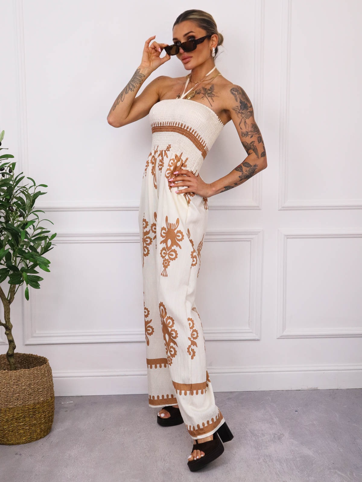 KOMBINEZON WZORZYSTY BEZ RAMIĄCZEK- BEŻOWY