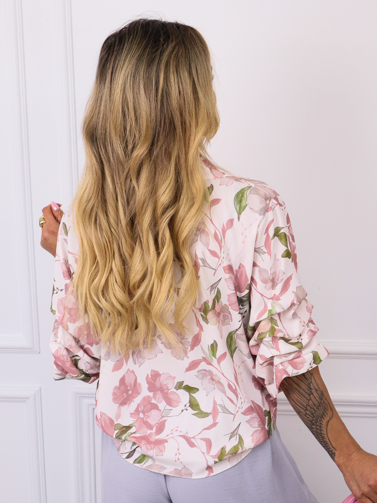 KOSZULA W JASNORÓŻOWE KWIATY Z DRAPOWANYMI RĘKAWAMI I WIĄZANIEM