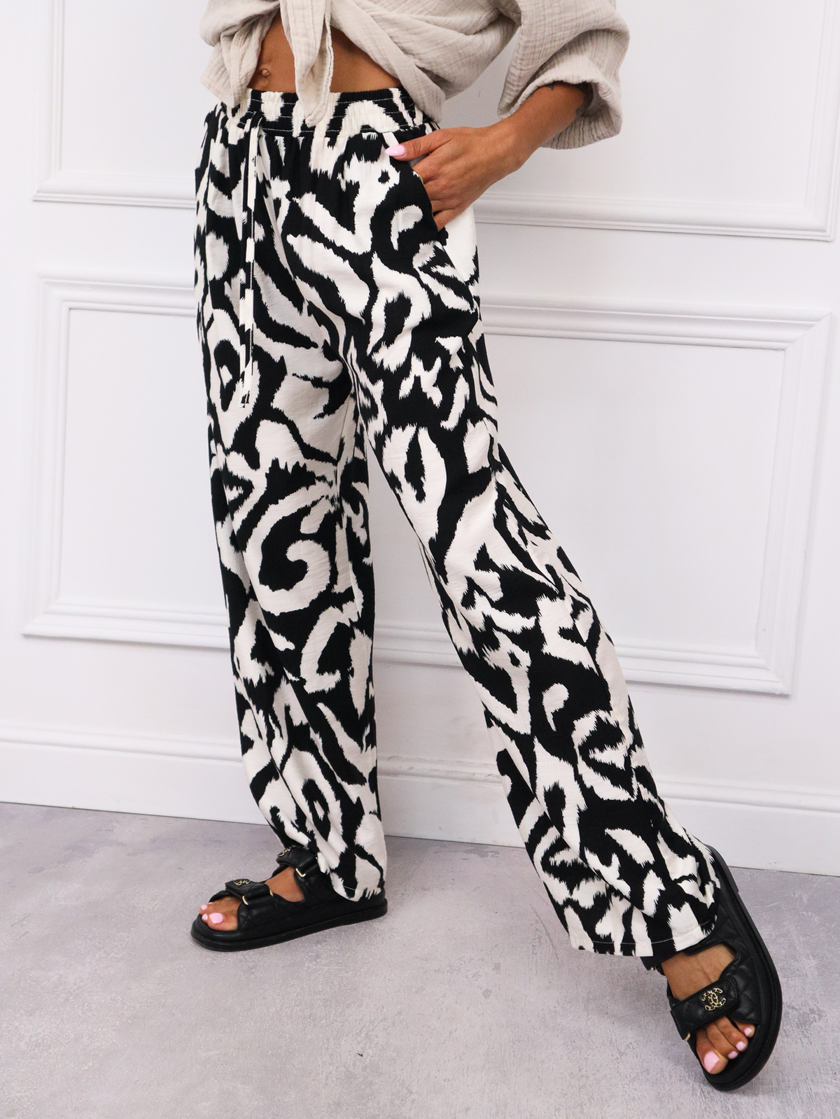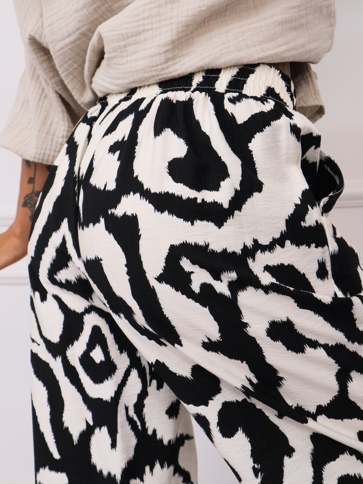 SPODNIE WZORZYSTE Z GUMĄ I WIĄZANIEM W PASIE- CZARNE