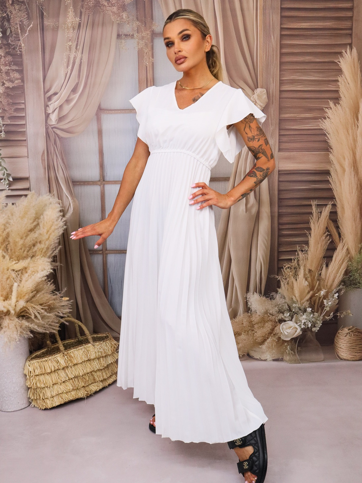 SUKIENKA MAXI PLISOWANA Z FALBANAMI PRZY RĘKAWACH- BIAŁA