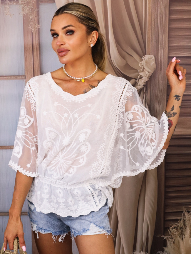 BLUZKA O KROJU NIETOPERZA BOHO Z HAFTOWANYM WZOREM- BIAŁA