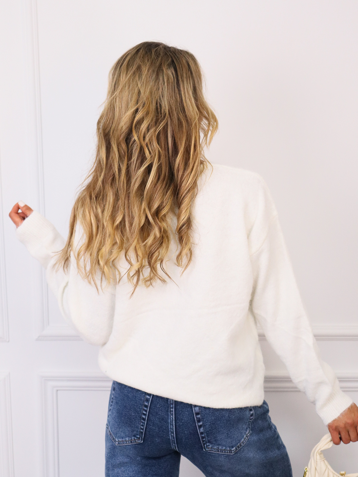 SWETER W KOKARDKI I DEKOLTEM W SZPIC- BIAŁY
