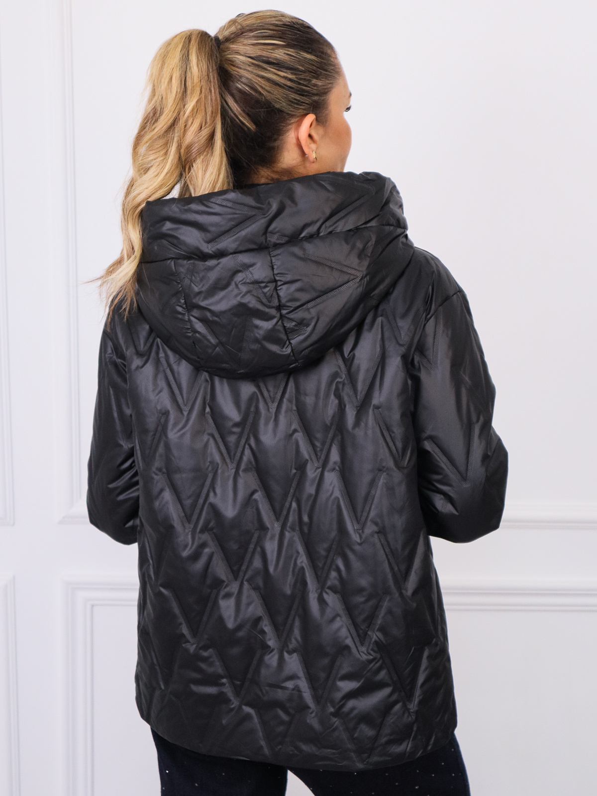 Pikowana asymetryczna kurtka z kapturem i ściągaczem na dole. Rękawy zakończone długim ściągaczem.