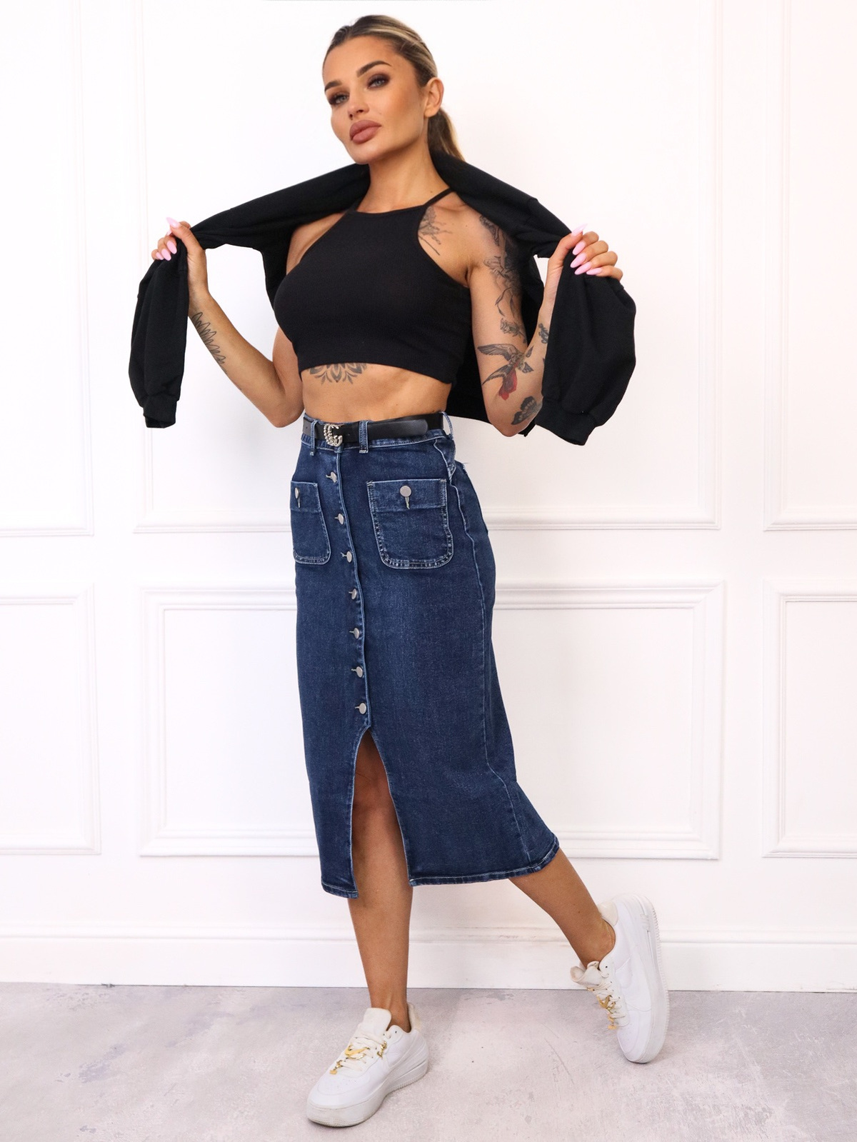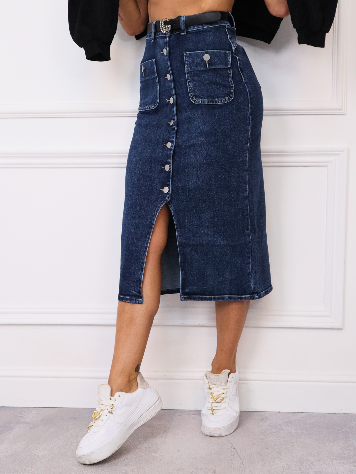 Jeansowa spódnica midi z guzikami z przodu i kieszeniami .Wysoki stan podkreśla talię,a uciągliwy jeans pięknie dopasowuje się do sylwetki Klasyka która pasuje do każdej stylizacji. Pasek gratis.