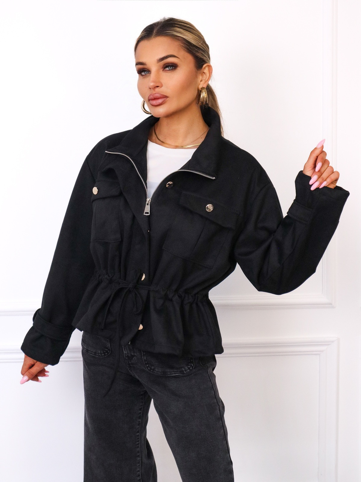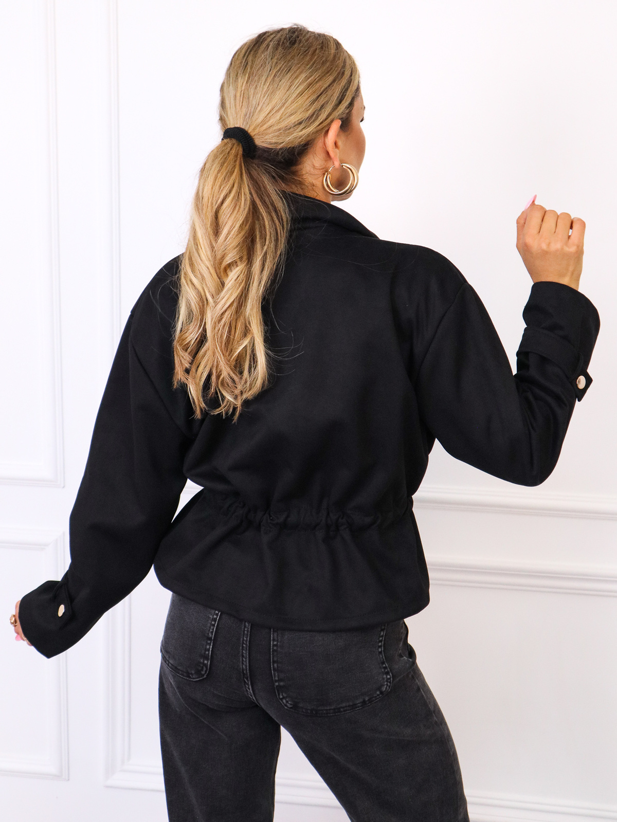 KURTKA Z IMITACJI ZAMSZU WIĄZANA W PASIE- CZARNA