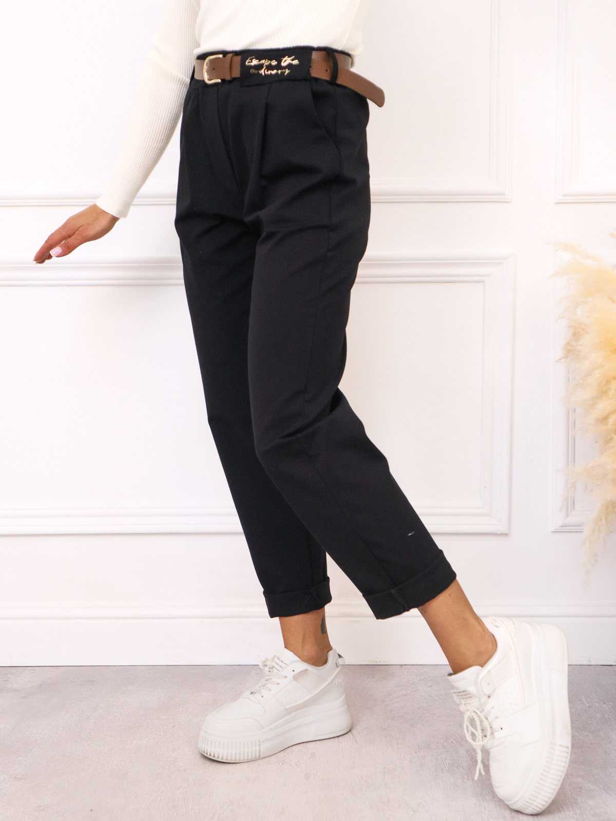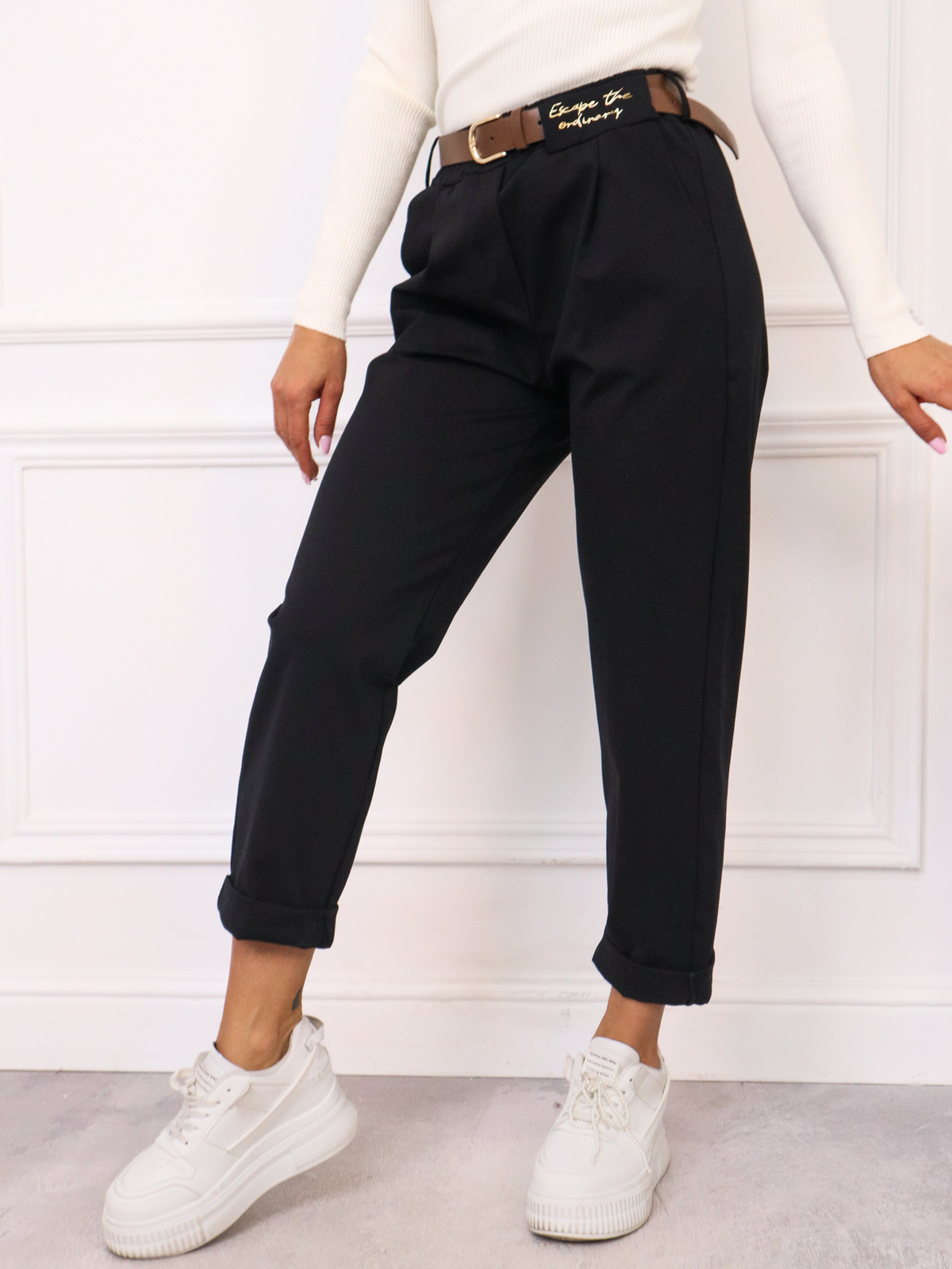 SPODNIE MATERIAŁOWE Z NASZYWKĄ+ PASEK- CZARNE
