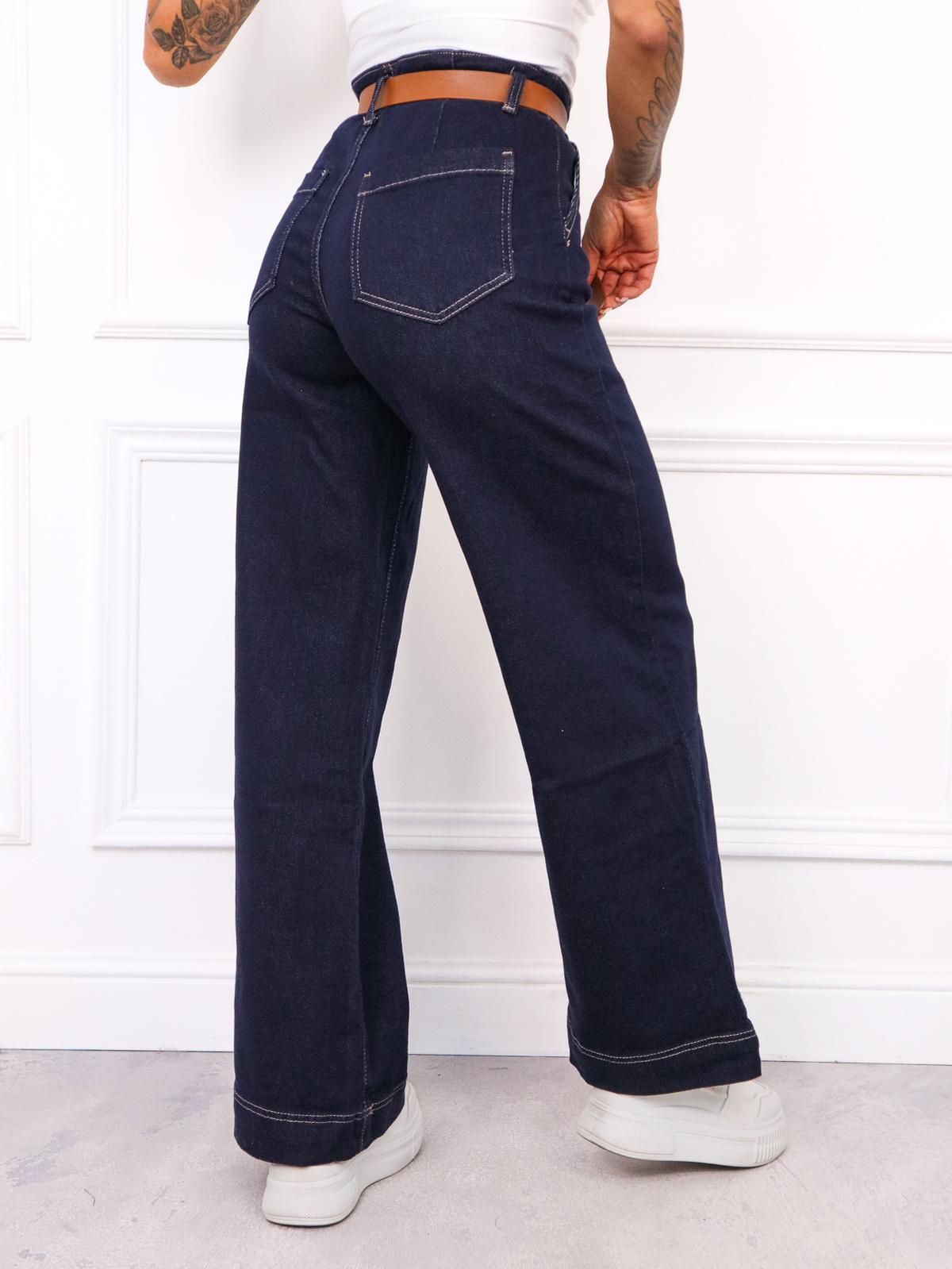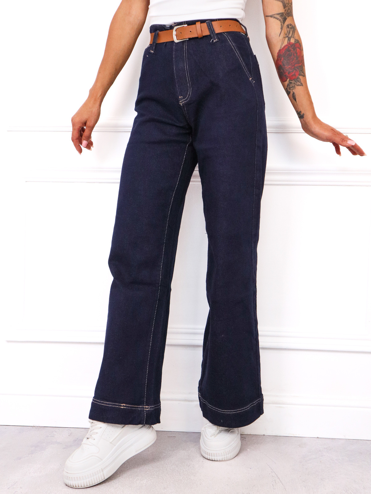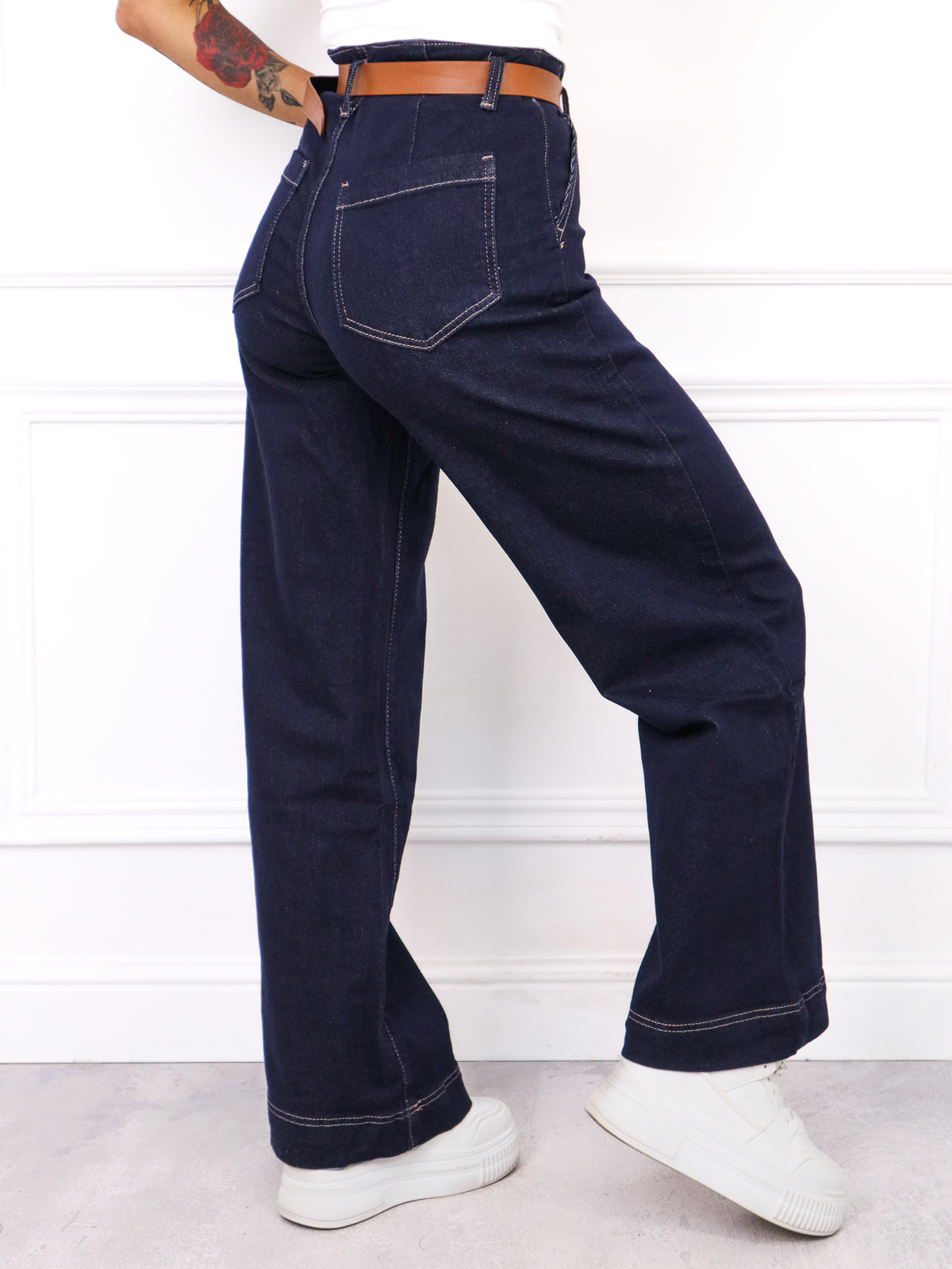 SPODNIE JEANSOWE Z WYSOKĄ TALIĄ I DŁUGIMI NOGAWKAMI + PASEK- GRANATOWE