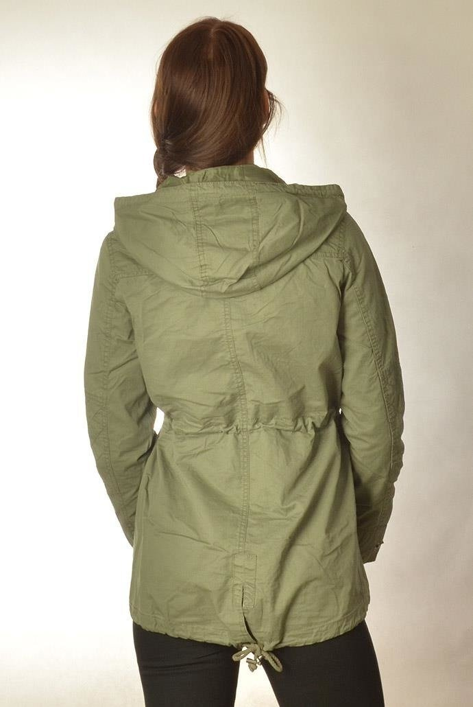ZIELONA KURTKA MATERIAŁOWA ZAPINANA NA ZAMEK I ZATRZASKI, KAPTUR NA ZAMEK, WIĄZANA W PASIE