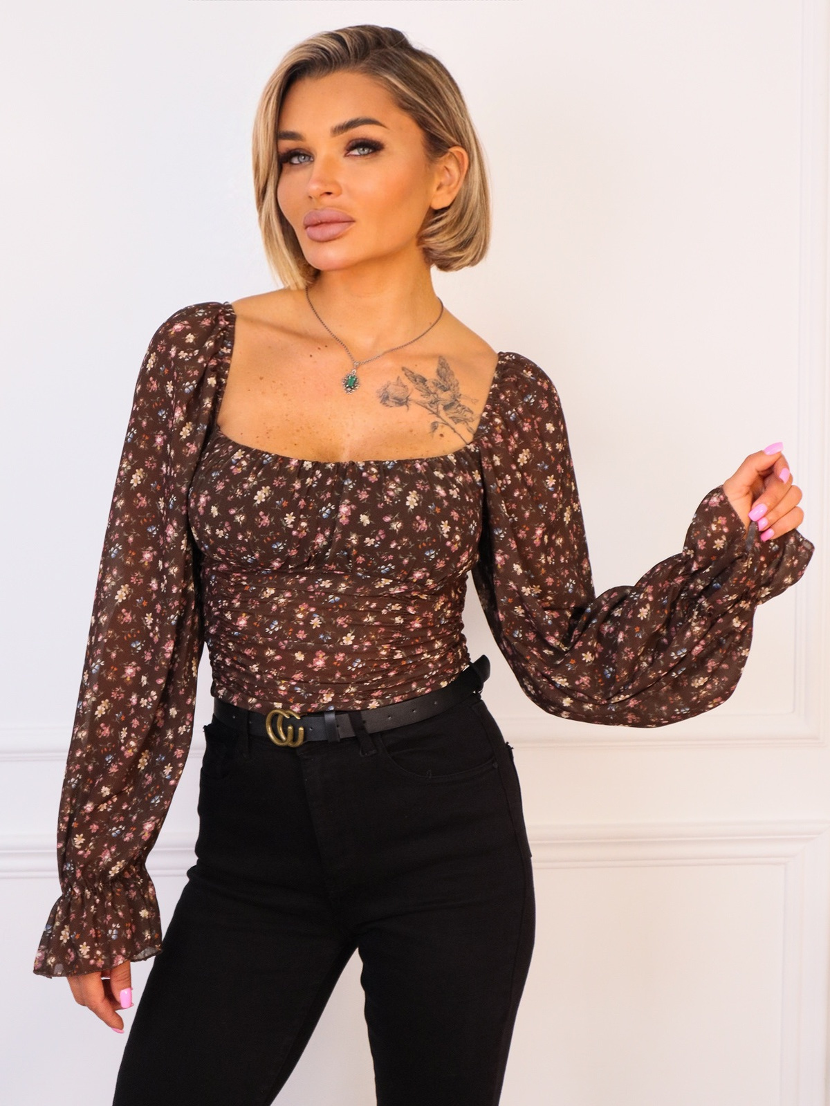 BLUZKA W KWIATY Z USZTYWNIANYMI MISECZKAMI- CZEKOLADOWA