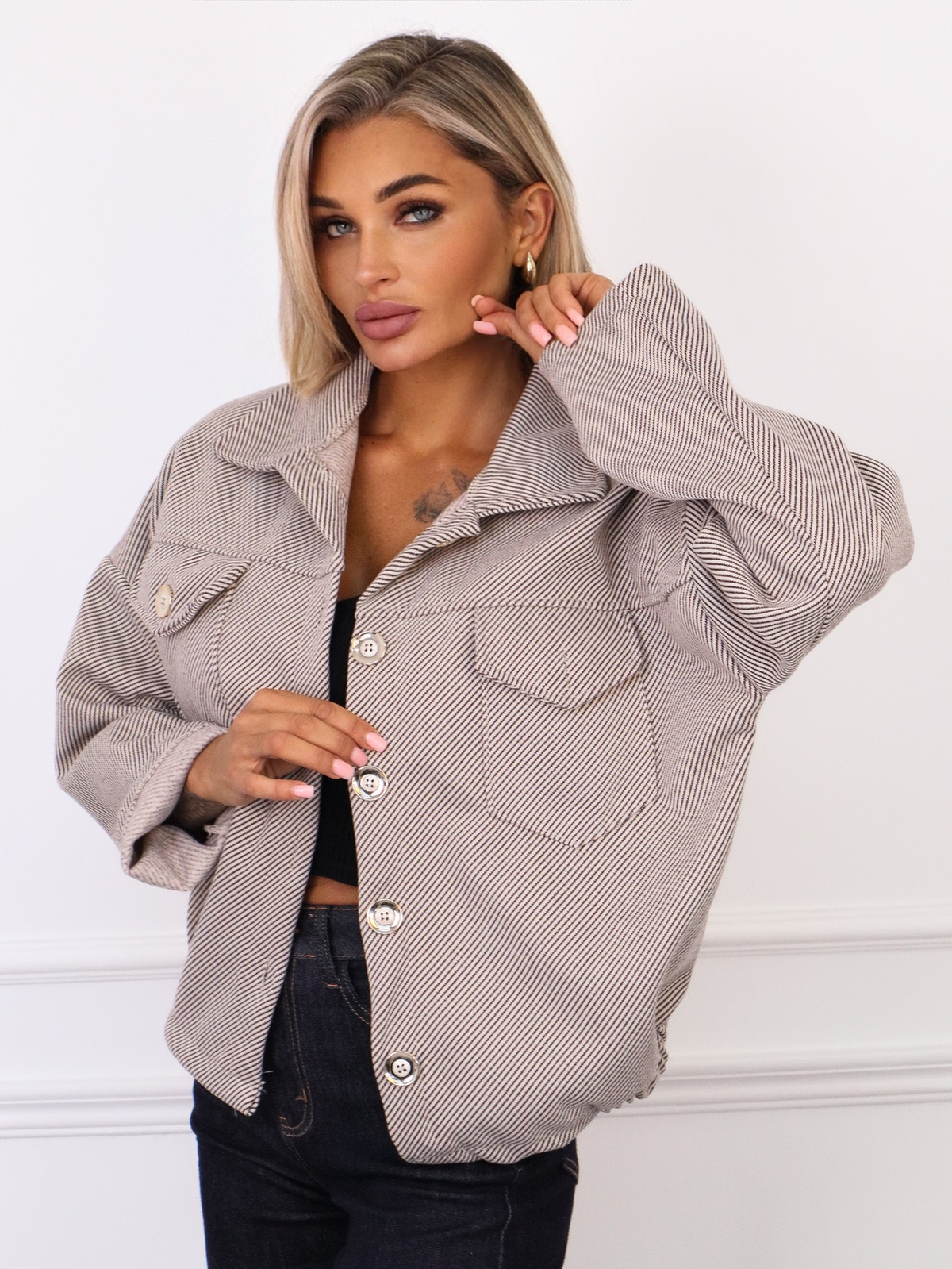 KURTKA OVERSIZE BEŻOWA W BRĄZOWE PASKI ZE ŚCIAGACZEM NA DOLE