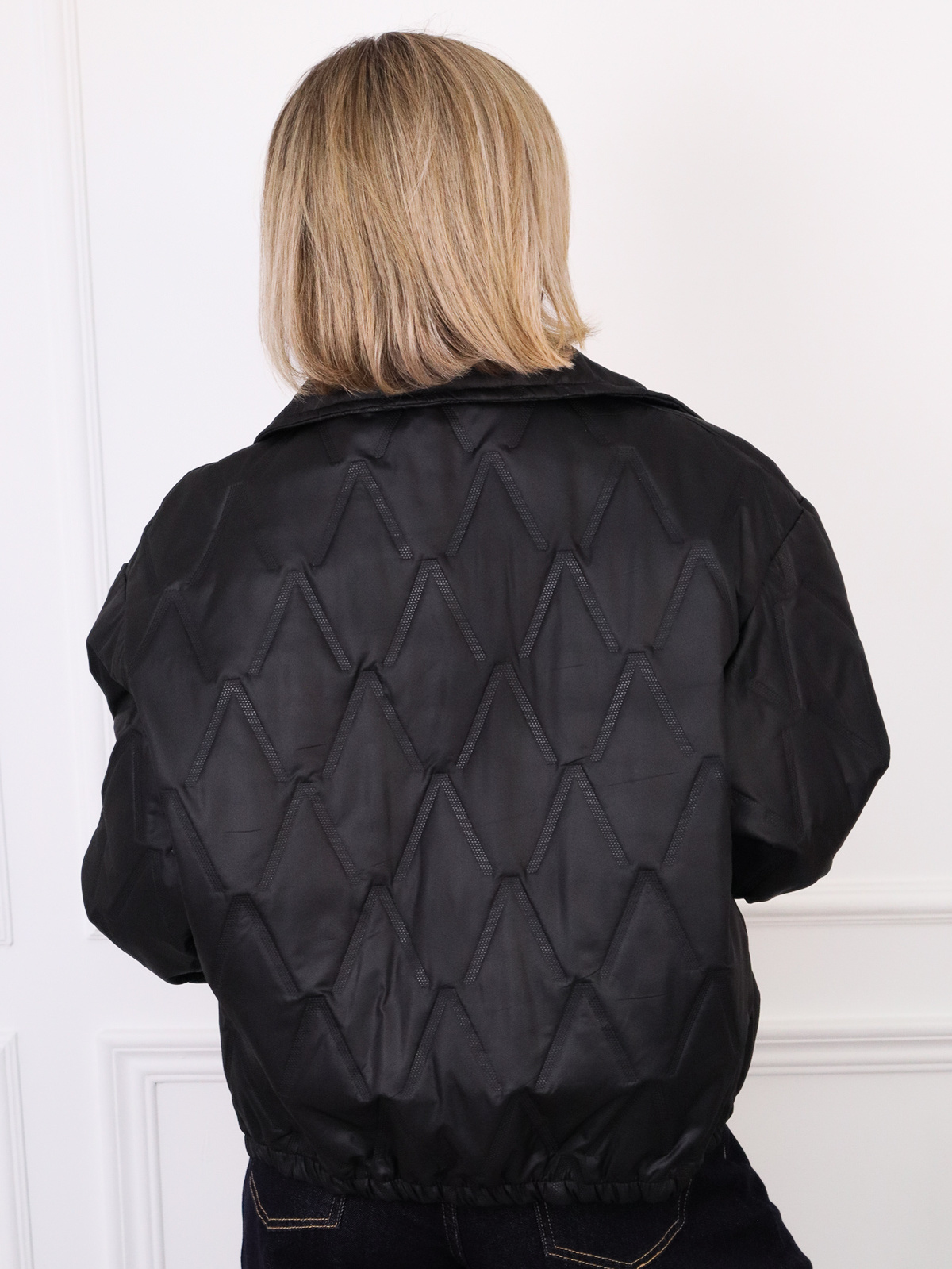 Kurtka przejściowa wykonana z pikowanej tkaniny z ozdobnym wzorem na całej powierzchni. Kurtka zapinana na złote guziki z kołnierzykiem. Na dole posiada gumkę.
