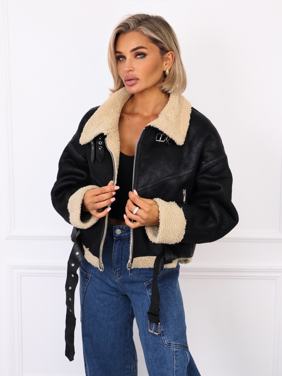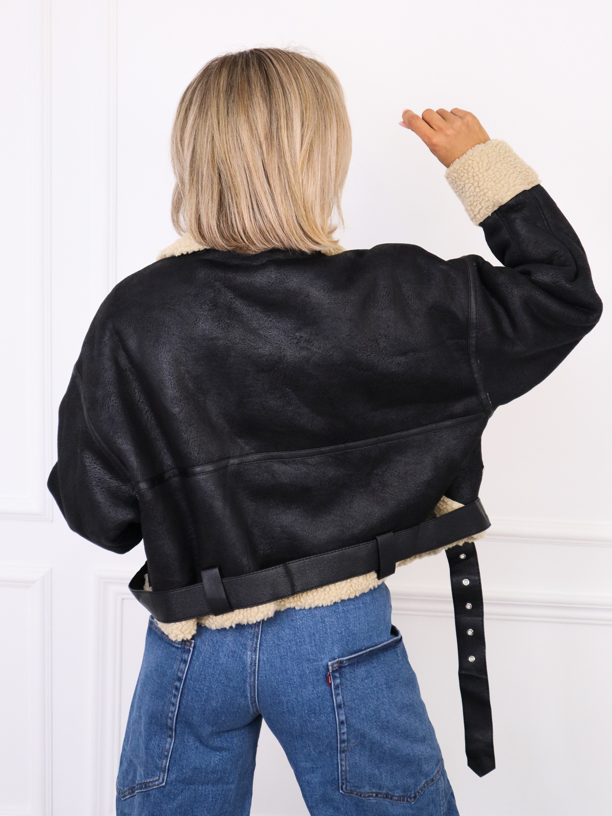 KURTKA ZIMOWA KOŻUSZEK Z PASKIEM NA DOLE- CZARNY