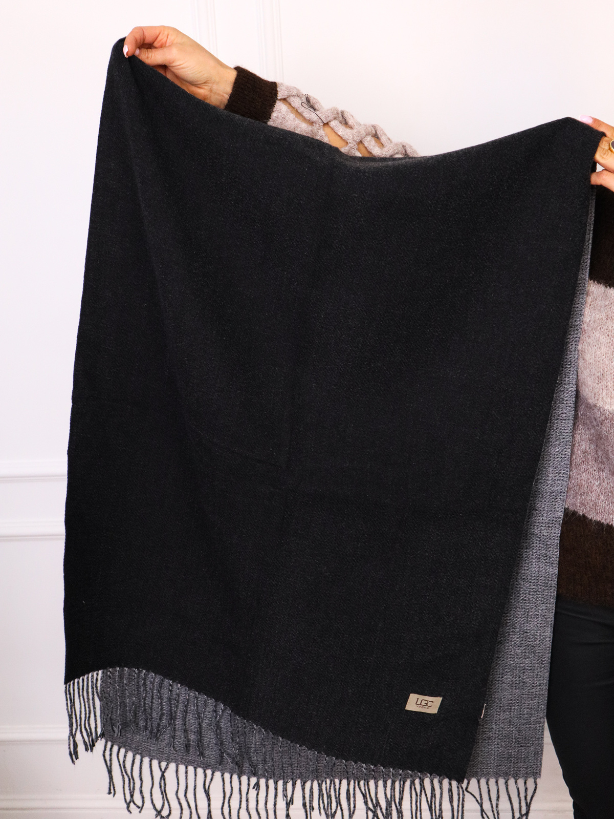 Klasyczny dzianinowy szal z frędzlami oraz subtelnym logo. Świetny wybór do wielu stylizacji na chłodniejsze dni.
