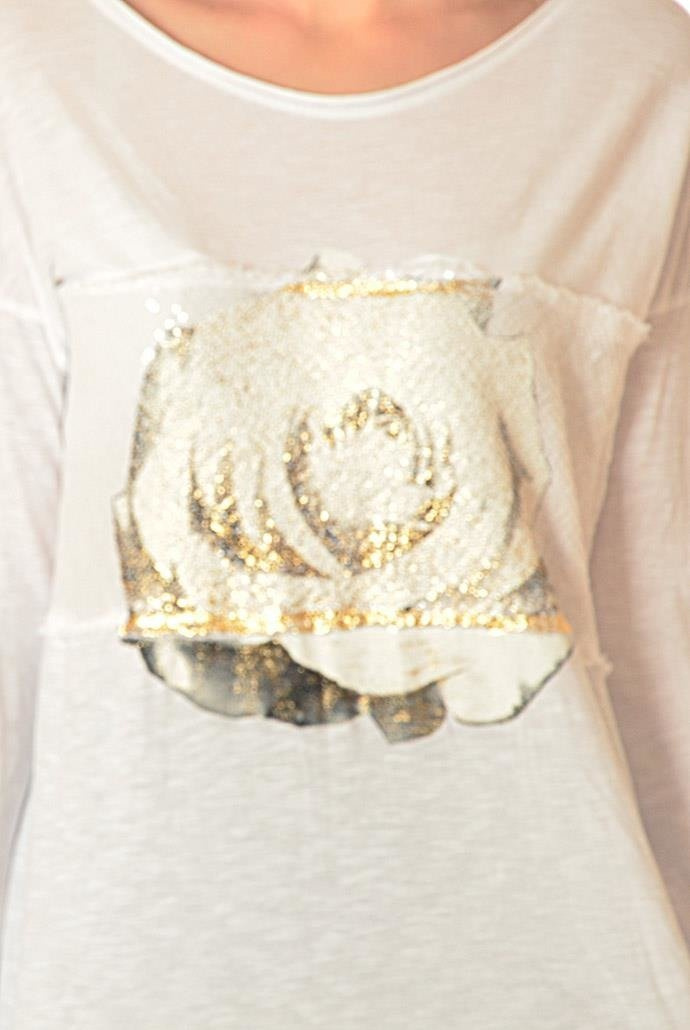 BIAŁA BLUZKA NA DŁUGI RĘKAW, Z PRZODU NADRUK RÓŻY ORAZ PAS CEKINÓW