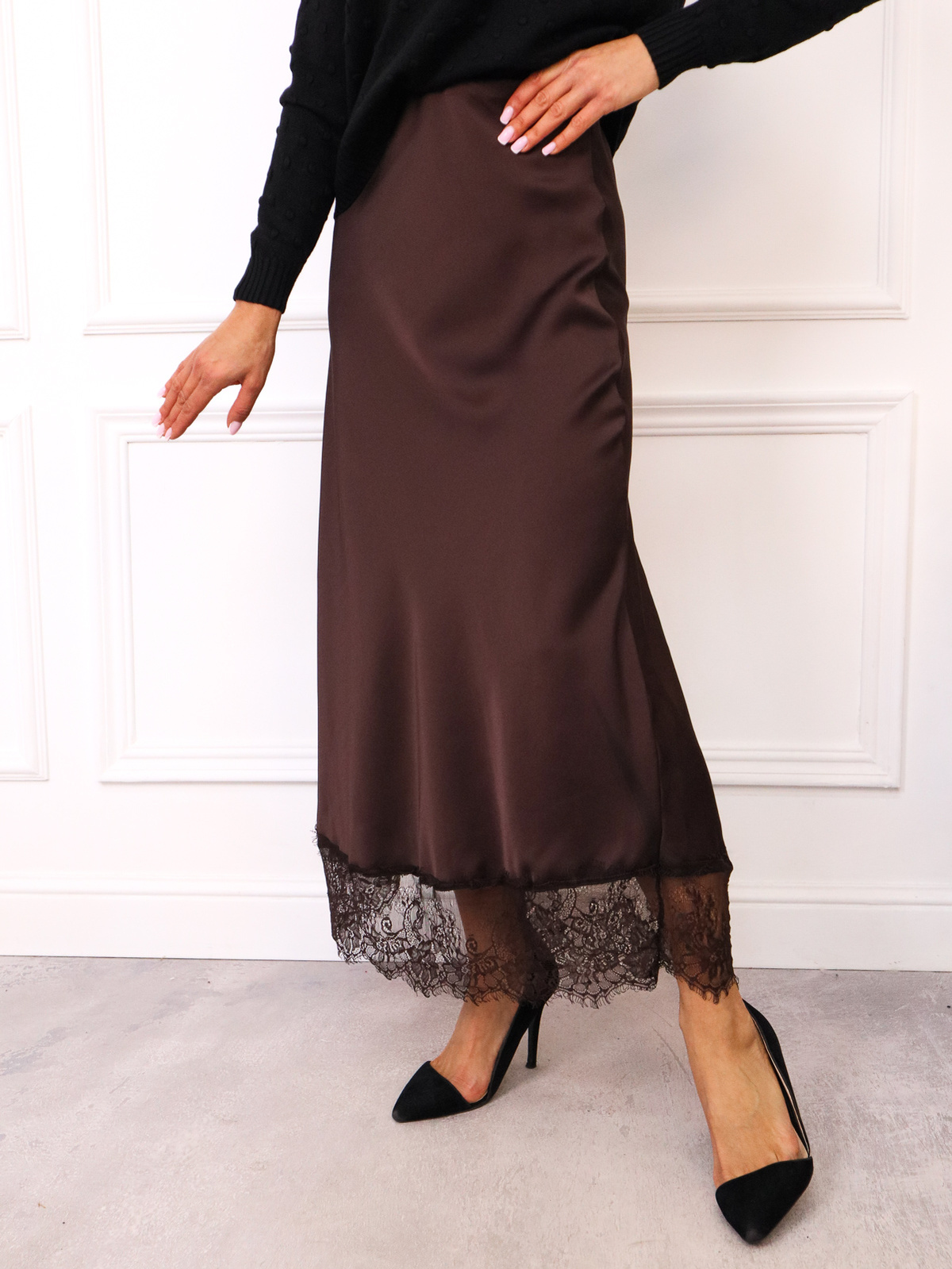 SPÓDNICA SATYNOWA MAXI ZAKOŃCZONA KORONKĄ-  CZEKOLADOWA