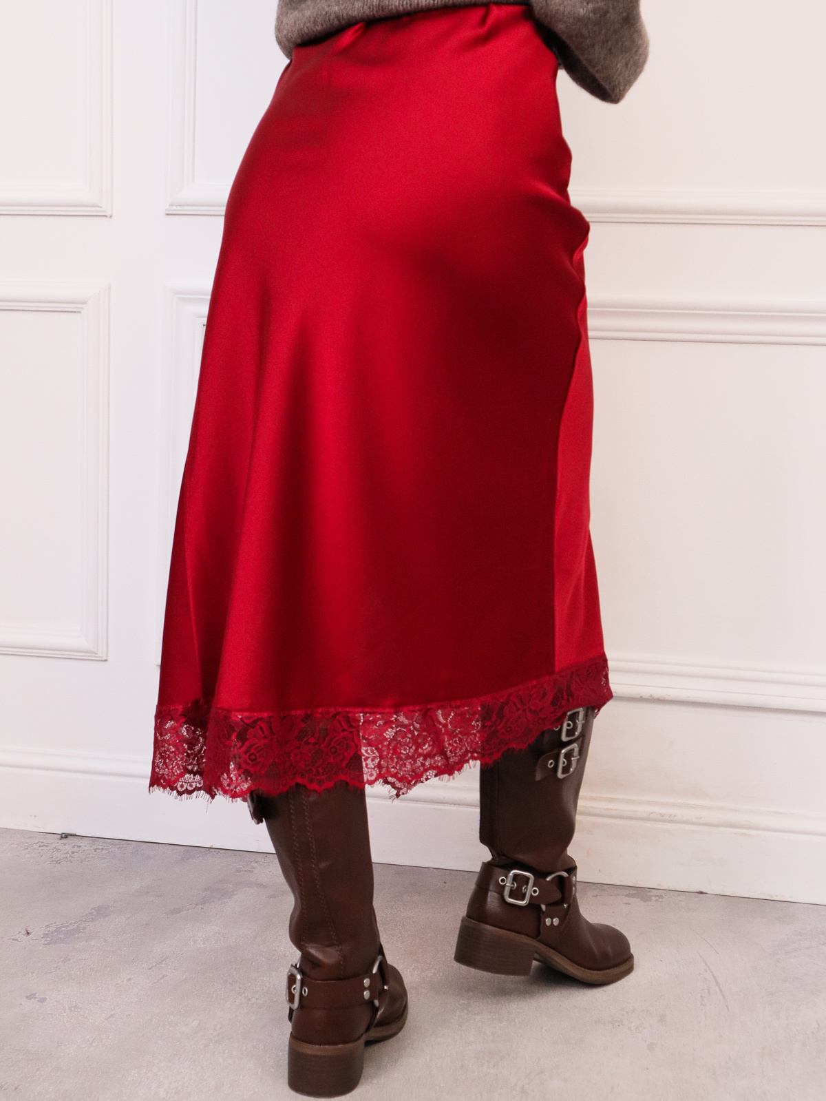 SPÓDNICA SATYNOWA MIDI Z ROZCIĘCIEM I KORONKĄ- BORDOWA