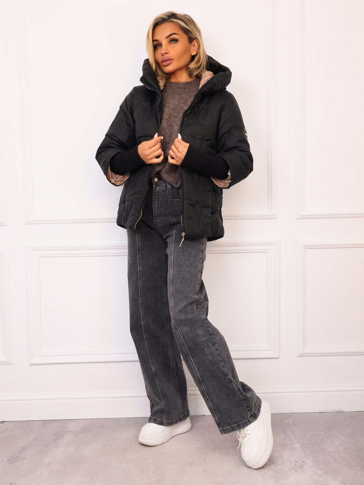 KURTKA ASYMETRYCZNA Z PRZEDŁUŻONYMI ŚCIĄGACZAMI PRZY RĘKAWACH- CZARNA