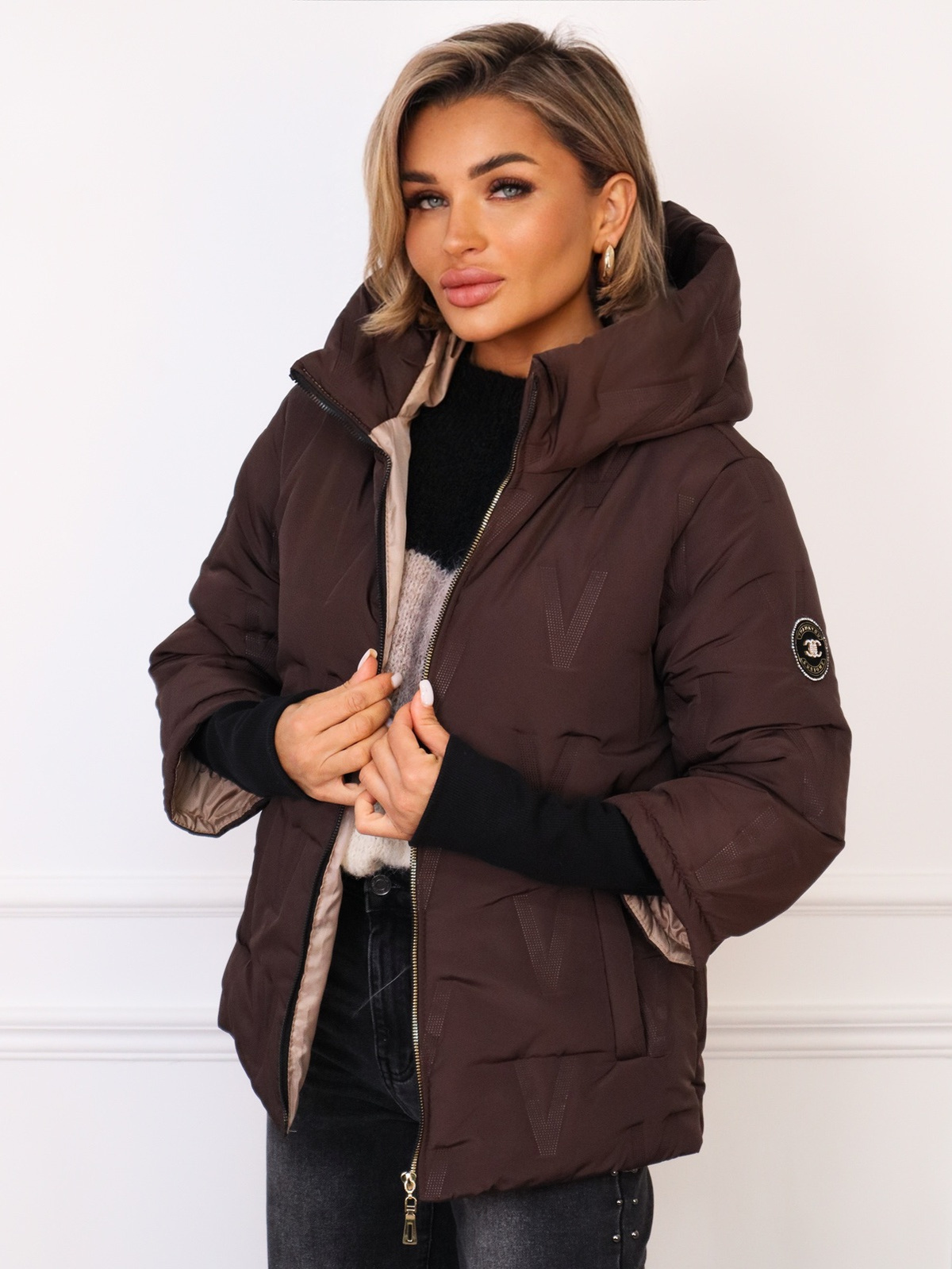Kurtka pikowana, asymetryczna z przedłużanymi ściągaczami przy rękawach. Kontrastowe obszycie kaptura w środku.