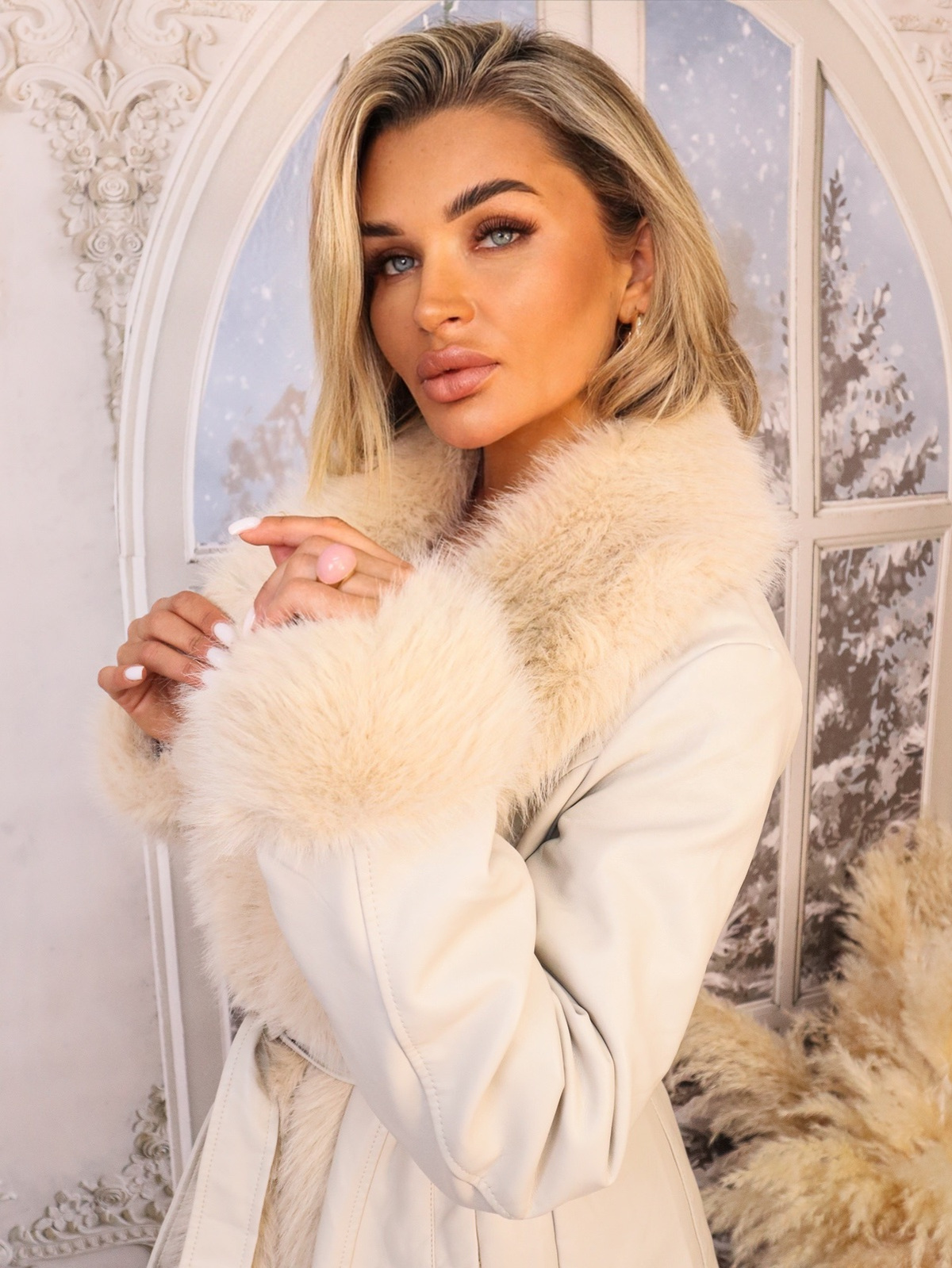 PŁASZCZ OCIEPLANY Z EKOSKÓRY Z FUTERKIEM WIĄZANY W PASIE- BEŻOWY