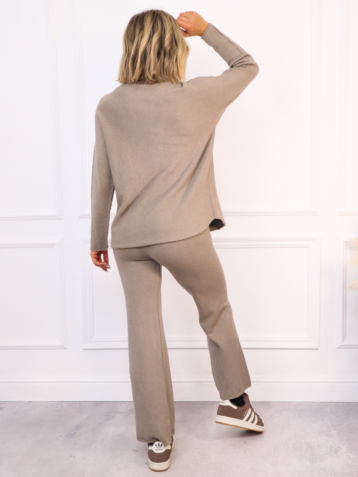 Dwuczęściowym komplet z dzianinowego materiału z dodatkiem wiskozy, który gwarantuje komfort noszenia. Składający się ze swetra z półgolfem i długimi rękawami oraz szerokich spodni z gumką w talii