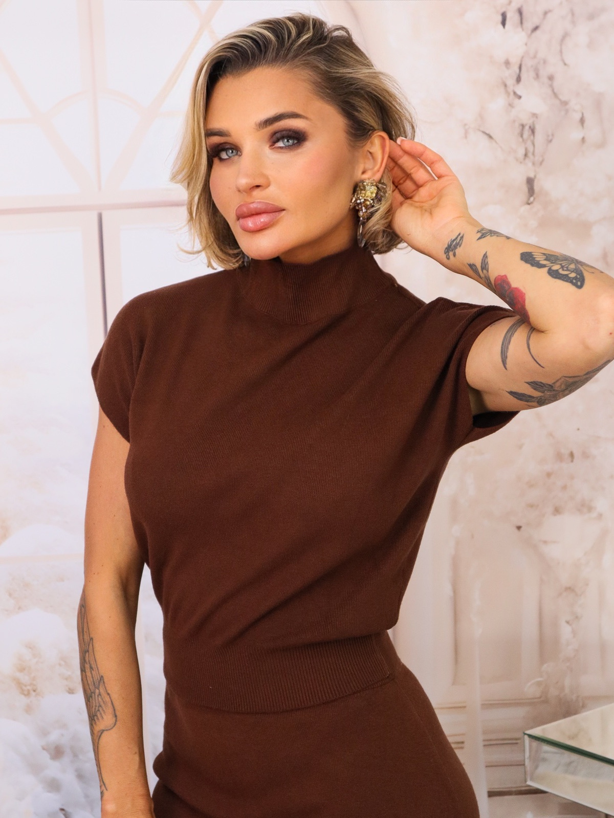 KOMPLET DZIANINOWY BLUZKA+ SPÓDNICA MIDI- CZEKOLADOWA