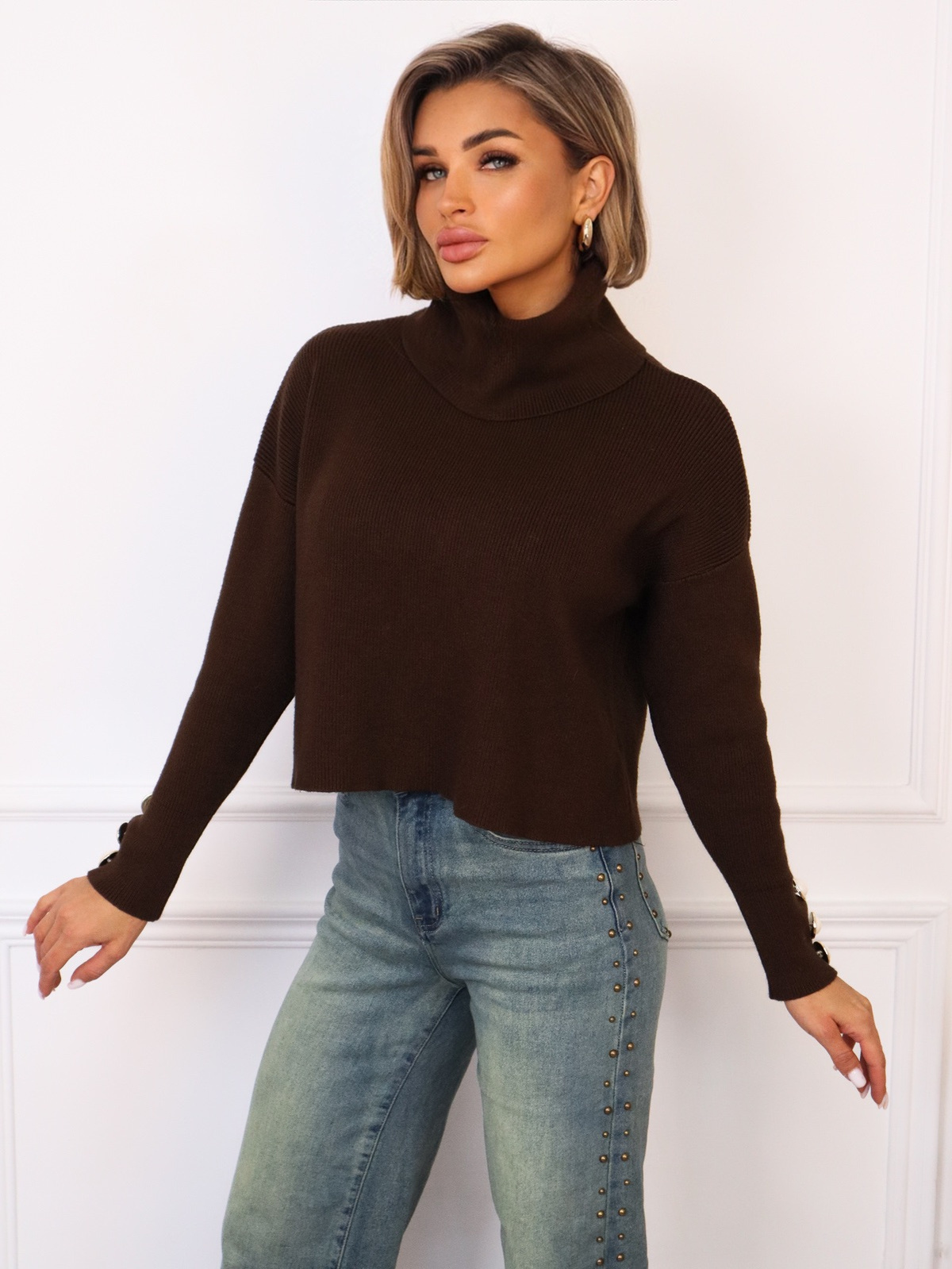 SWETER Z GOLFEM I OZDOBNYMI GUZIKAMI NA MANKIETACH- CZEKOLADOWY