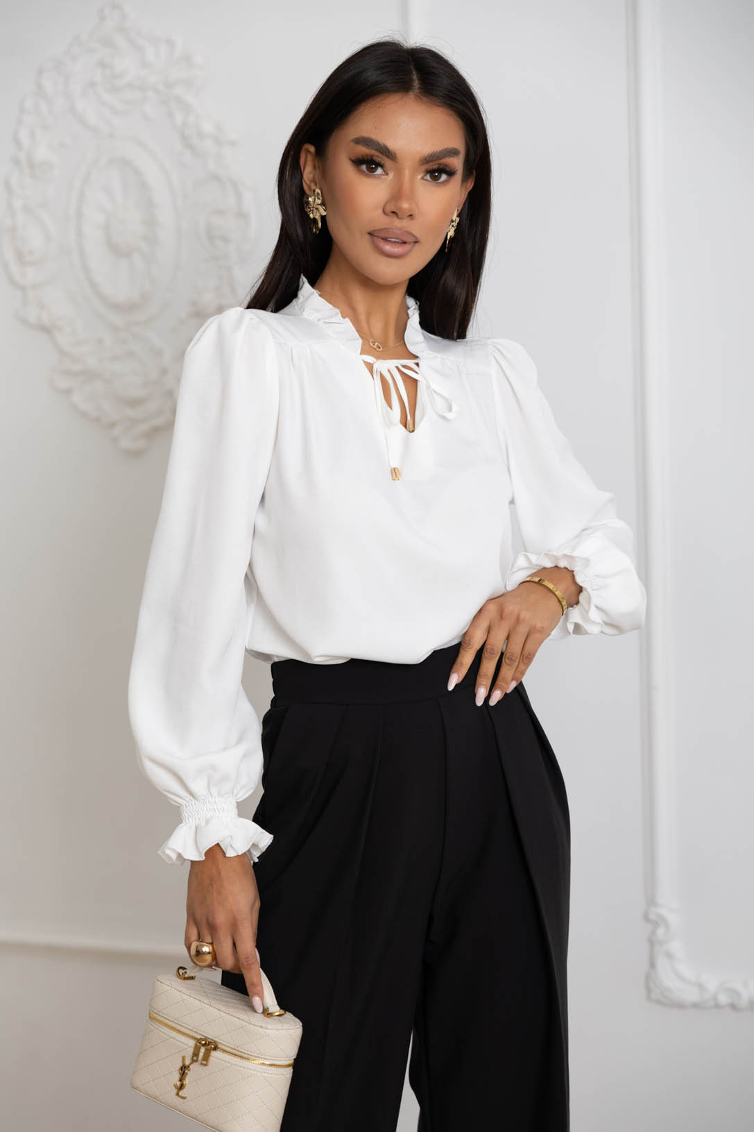 BLUZKA Z FALBANKĄ POD SZYJĄ I NA RĘKAWACH- ECRU