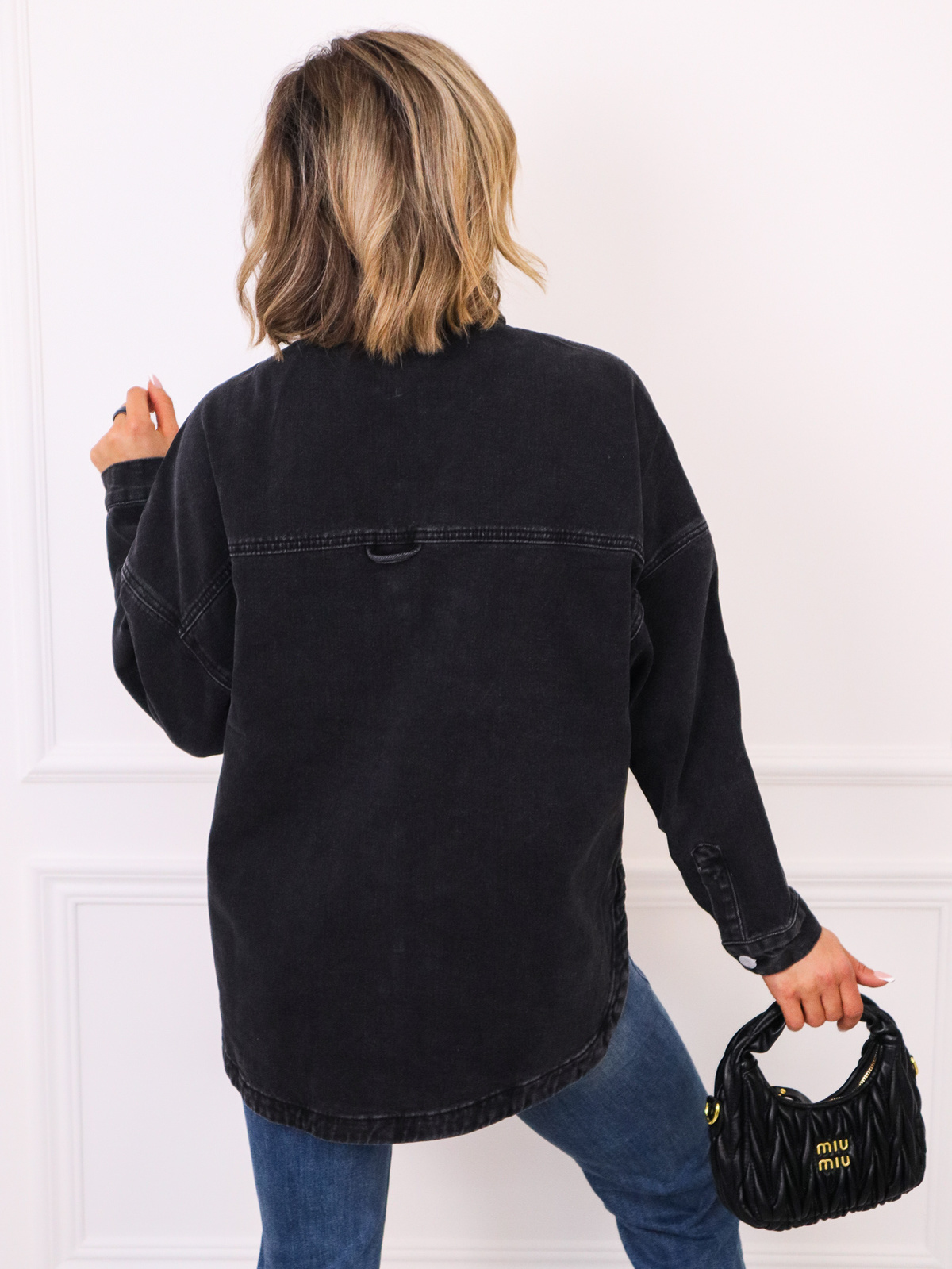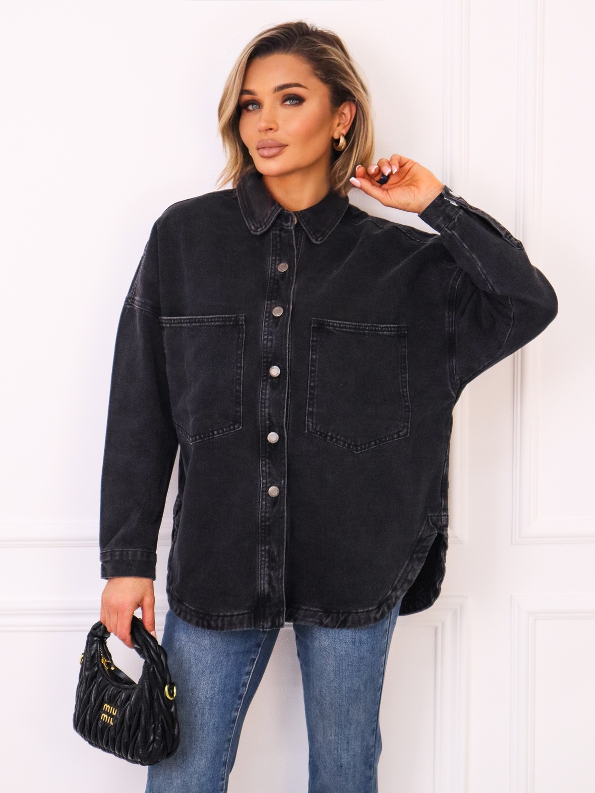 Koszula jeansowa z kieszeniami, zapinana na guziki.