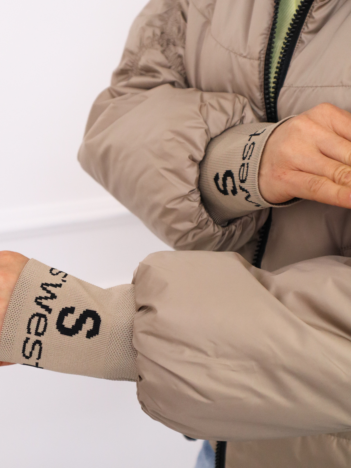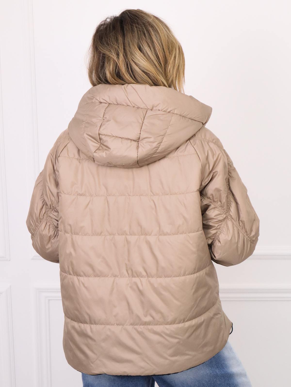 Kurtka przejściowa z ozdobnymi przeszyciami na rękawach i przedłużanym ściągaczem z aplikacją.