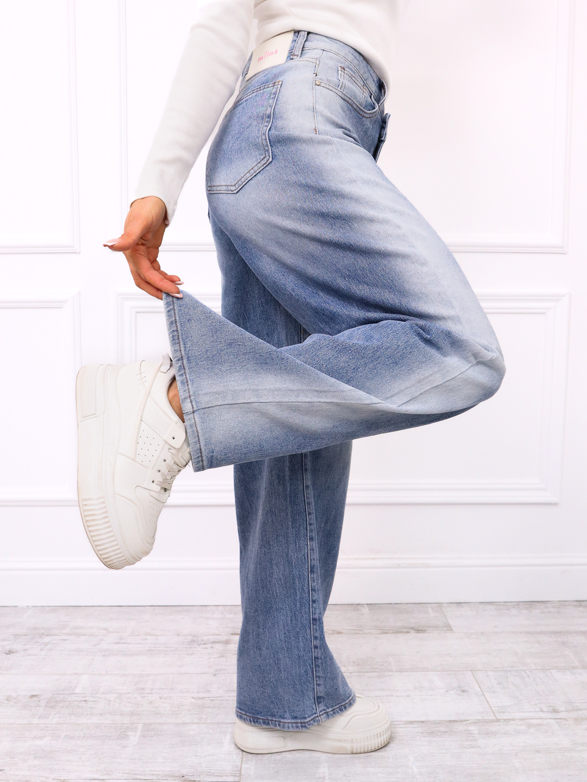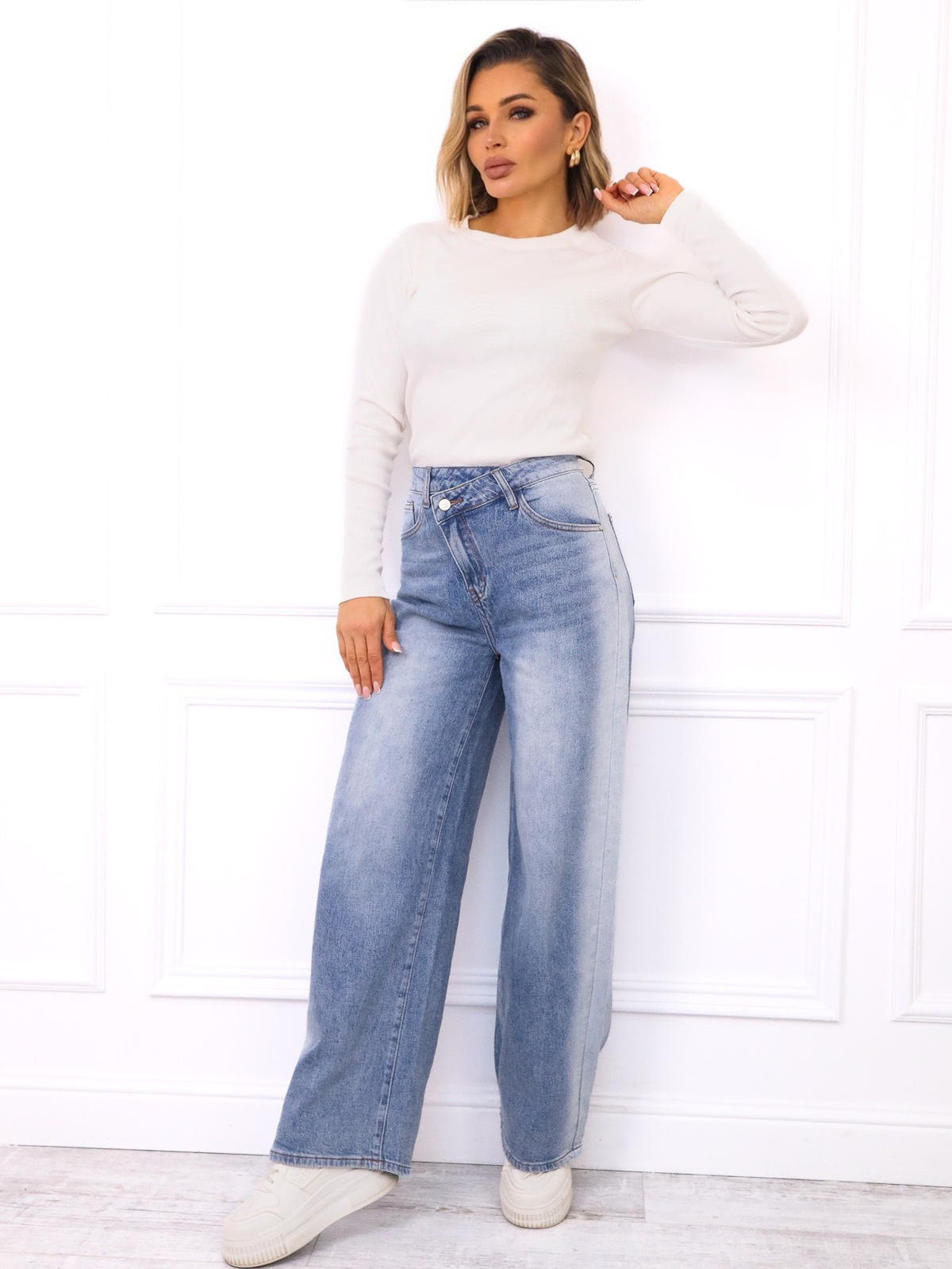 Jeansy o swobodnym kroju z wysokim stanem wykonane z bawełnianego denimu. asymetryczne zapięcie na guzik oraz suwak długie proste nogawki dwie kieszenie z przodu oraz dwie z tyłu