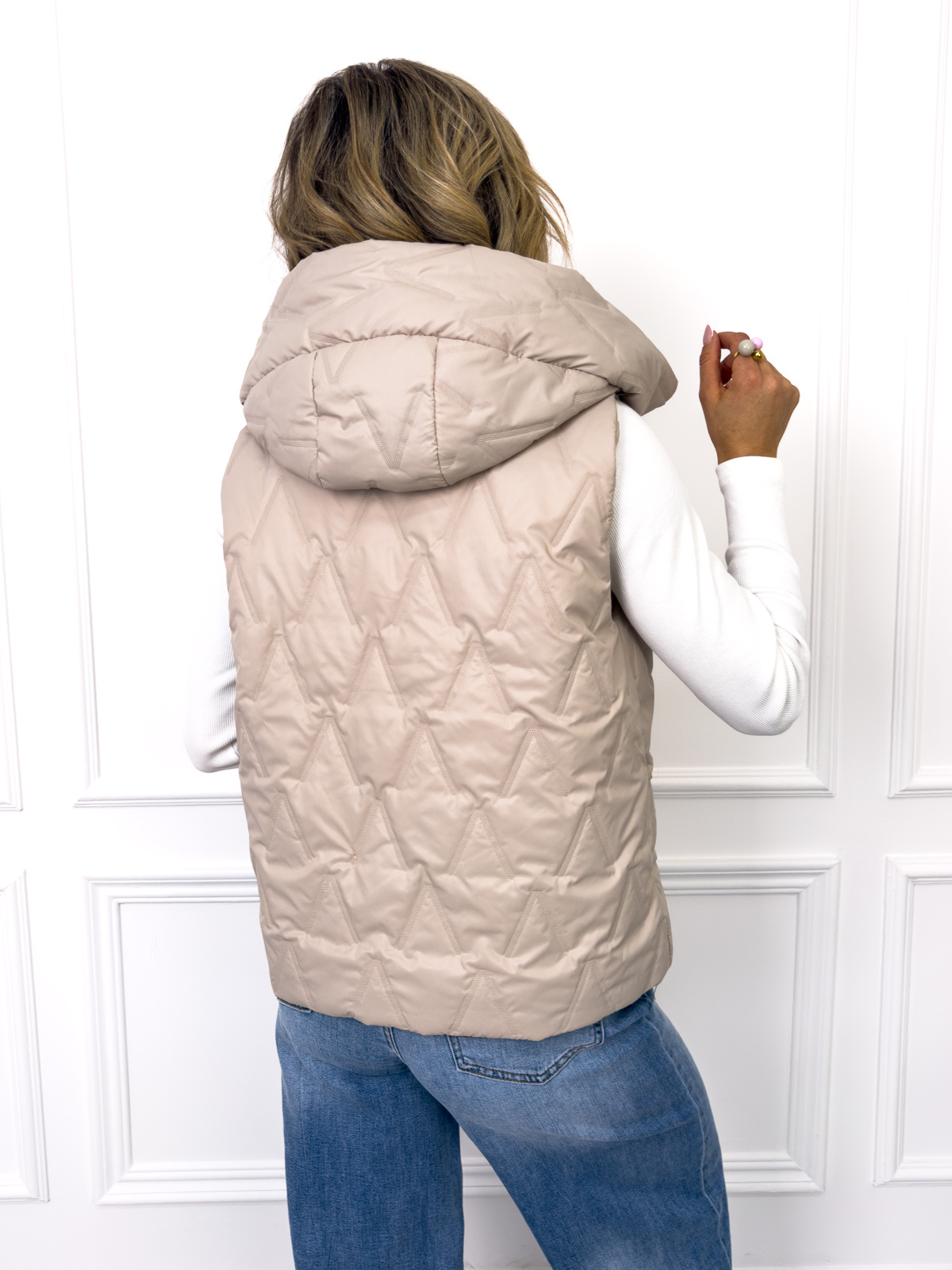 Kamizelka pikowana z kapturem i ozdobną naszywką. Posiada kieszenie.