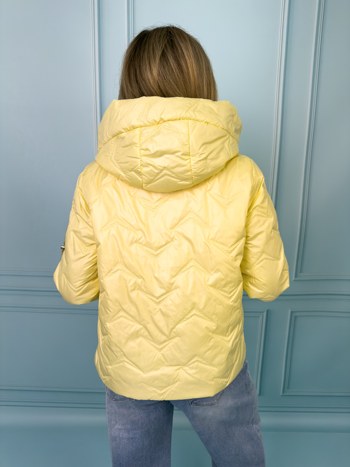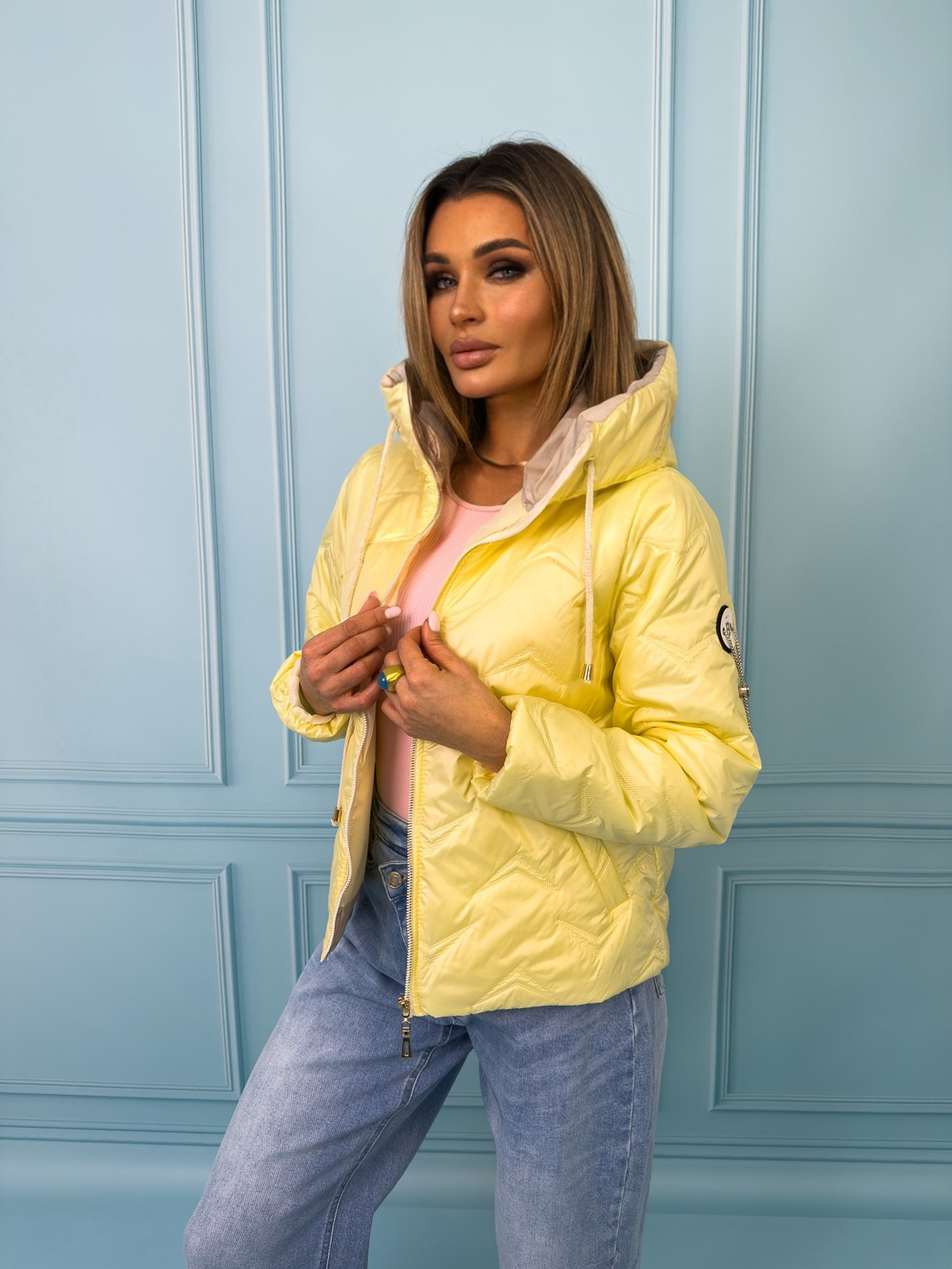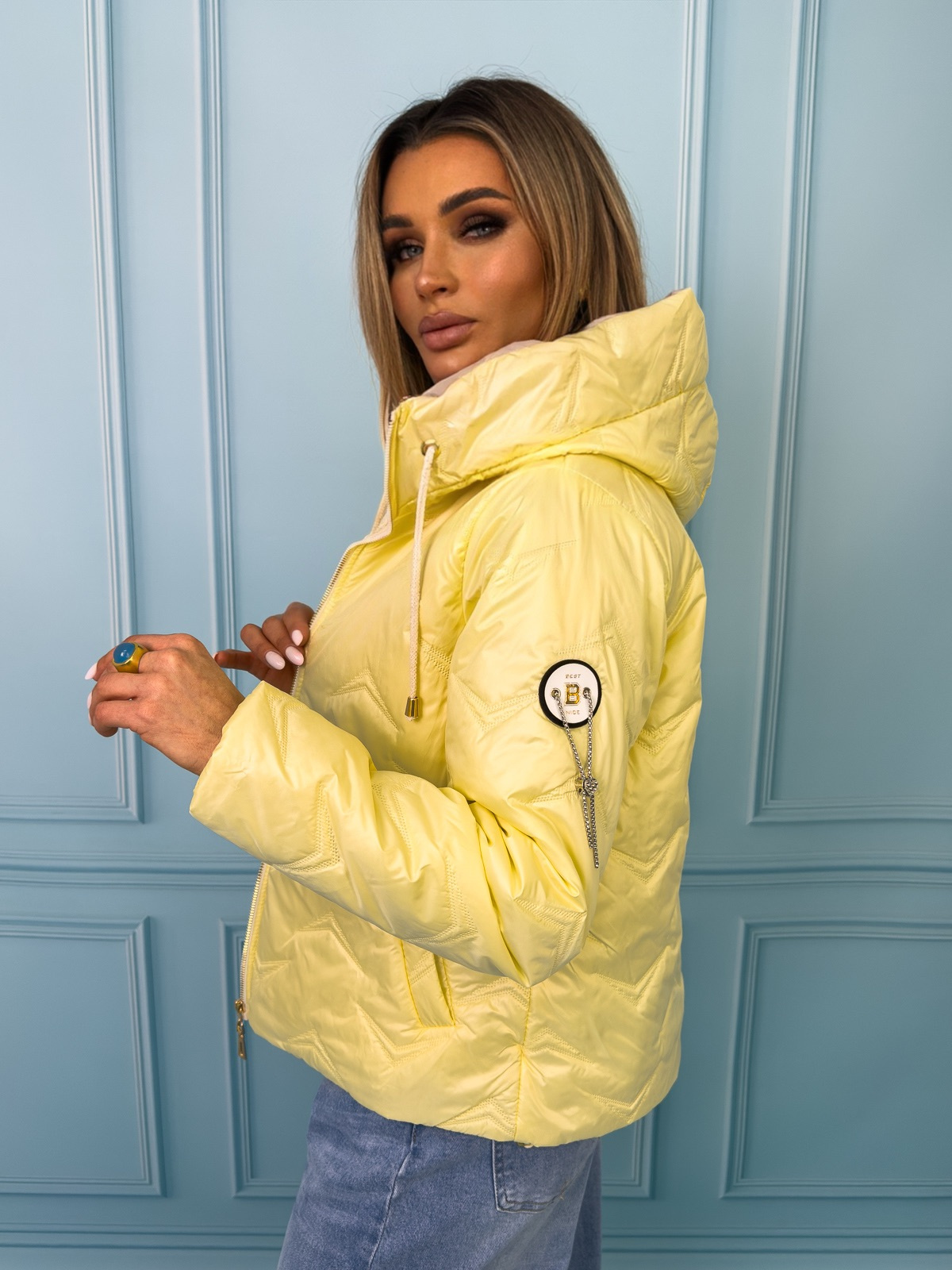 Kurtka przejściowa, pikowana z kapturem i ściągaczami po bokach i ozdobną naszywką na rękawie.
