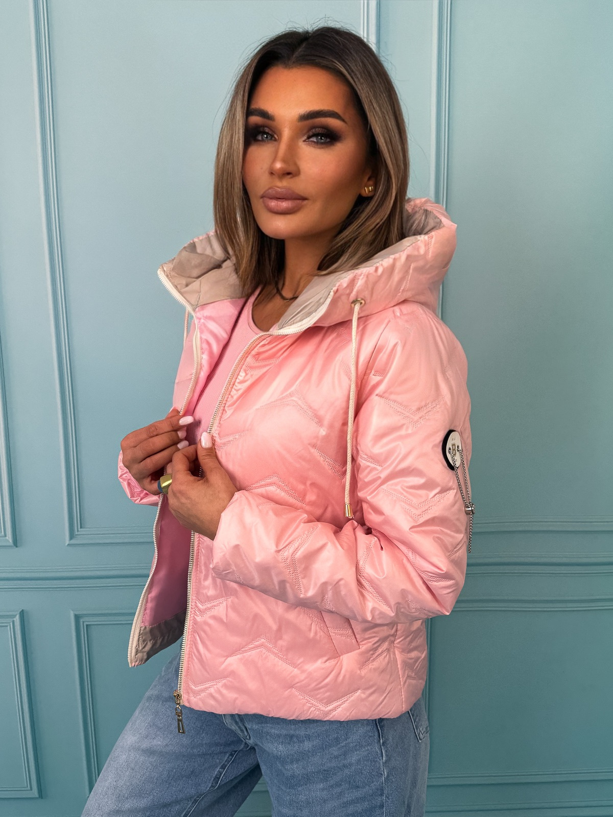 Kurtka przejściowa, pikowana z kapturem i ściągaczami po bokach i ozdobną naszywką na rękawie.