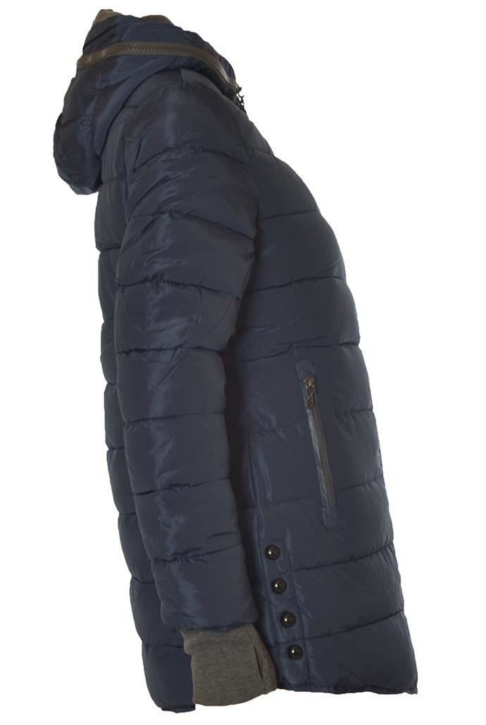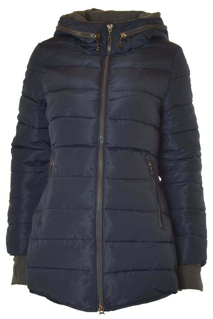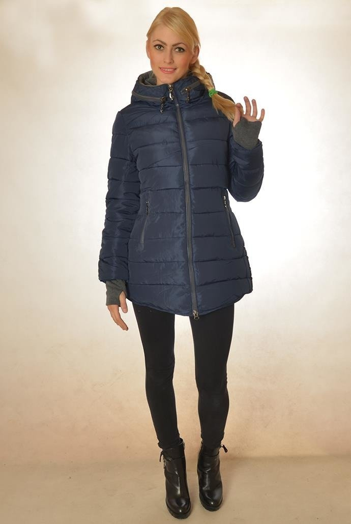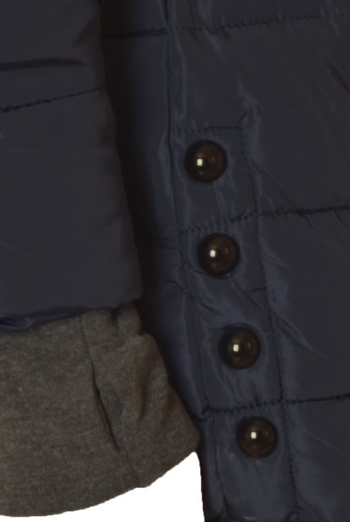 Granatowa,ortalionowa kurtka pikowana. Posiada kaptur z bawełnianą podszewką oraz z zamkami. Środek kurtki jest ocieplany futerkiem. Na końcach rękawów są ściągacze.