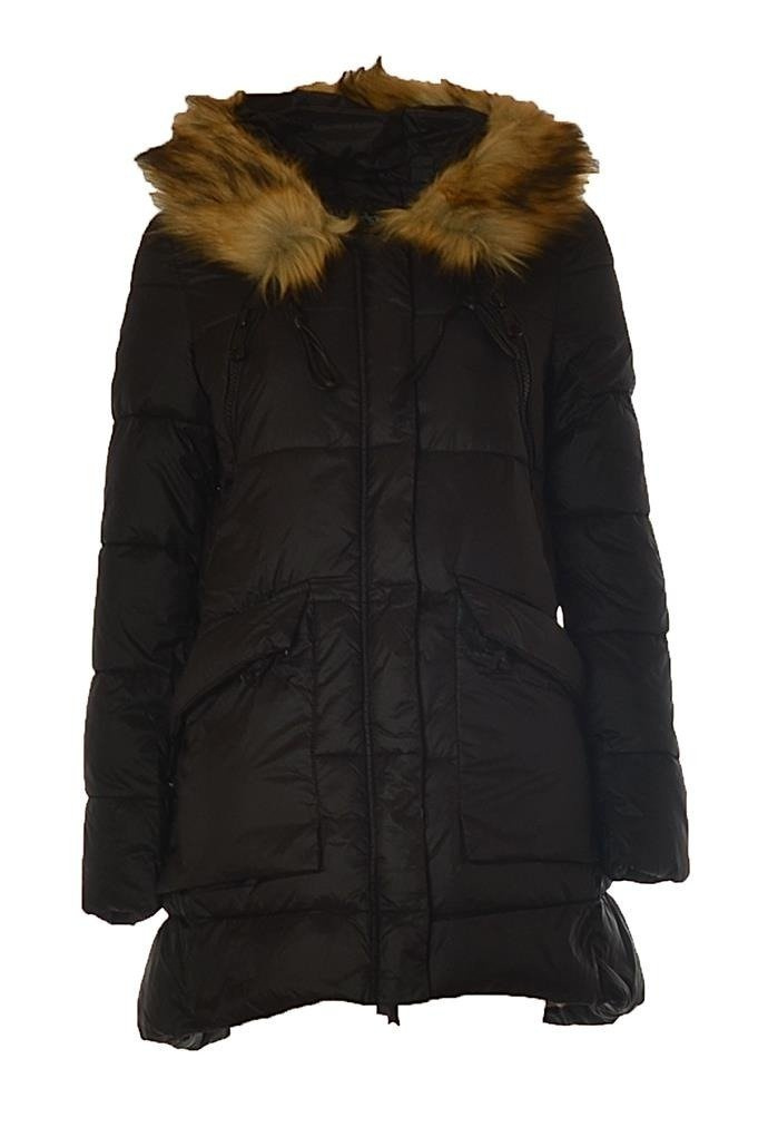 Czarna kurtka zimowa zapinana na zamek oraz zatrzaski. Kaptur z doczepianym futerkiem. Rękawy wykończone ocieplanym ściągaczem.