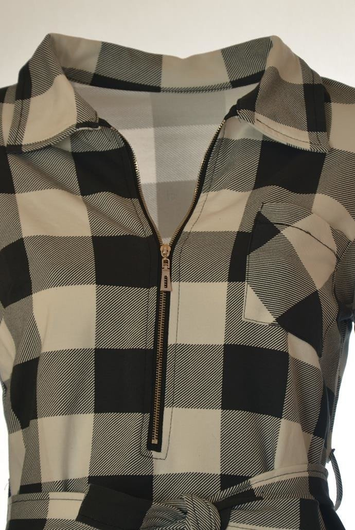 Biało-czarna sukienka w kratę, wiązana w pasie oraz zapinana na zamek. Z przodu naszyta kieszonka.